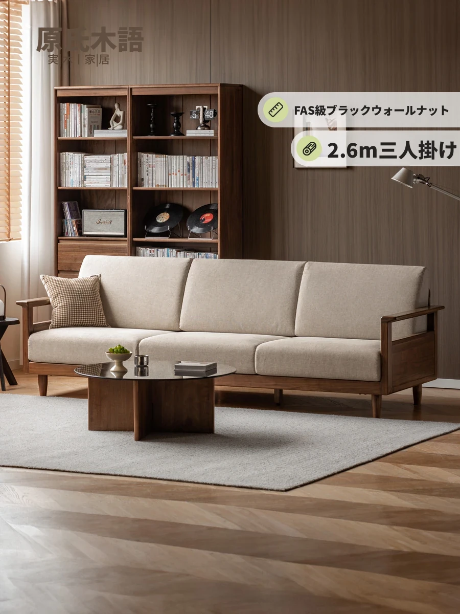 源氏木語 プレミアム無垢材ソファ モダンミニマリストスタイル 布張り ウォールナット3人掛け 新中式デザイン リビングに最適な癒しの空間を演出!