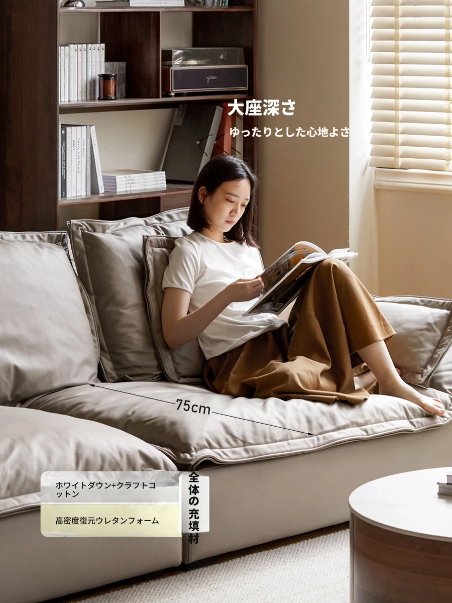 源氏木语の本革ソファ | フランス風レトロ雲朵ダウンソファ | リビングに最適な高級本革ブラックストレートソファ | おしゃれで快適な癒しの空間を演出!