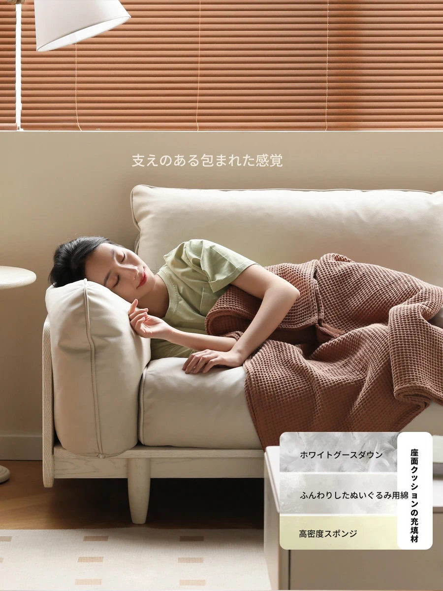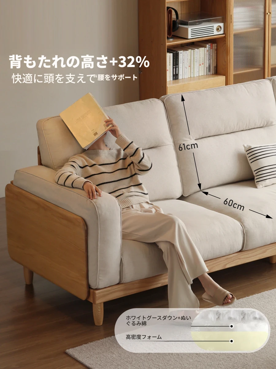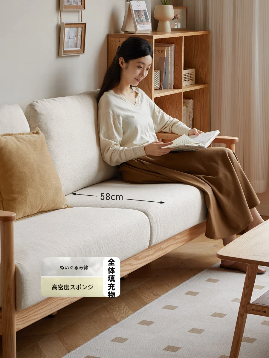 源氏木语のクリーム調無垢材ソファ - リビングを演出するテクスチャー豊かな布製ストレートソファ、ホワイトオークの美しさを生かした家庭用ソファ。快適さとスタイルを両立したデザインで、あなたの空間を格上げします!