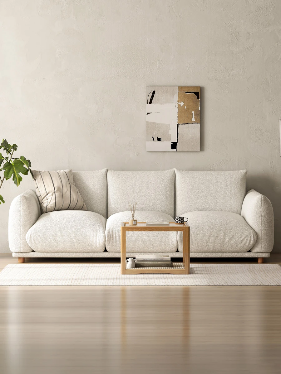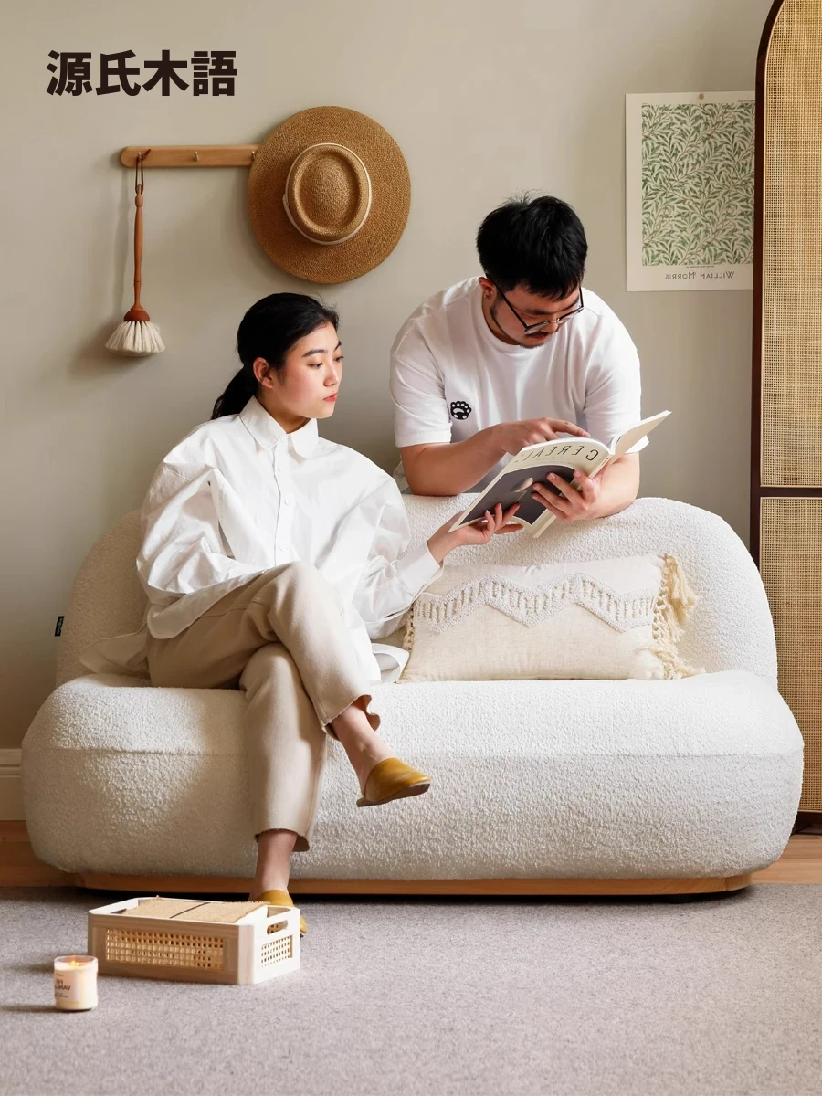 源氏木語の布製ソファ|和の侘寂スタイル|リビングにぴったりなクリーム色のフェイクラムソファ|心地よい触り心地で、優雅な空間を演出!