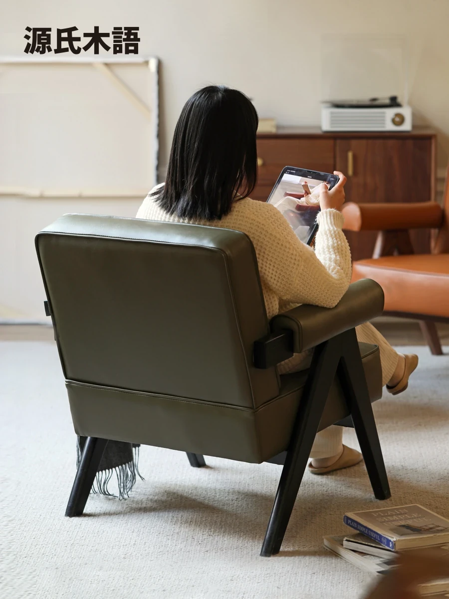 源氏木語レトロ本革ソファチェア モダンなヴィンテージスタイル 単独リラックスチェア バルコニーにも最適 チャンディガールチェア 心地よいひとときをあなたに!