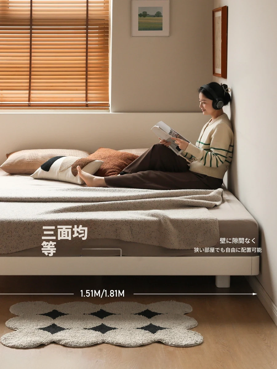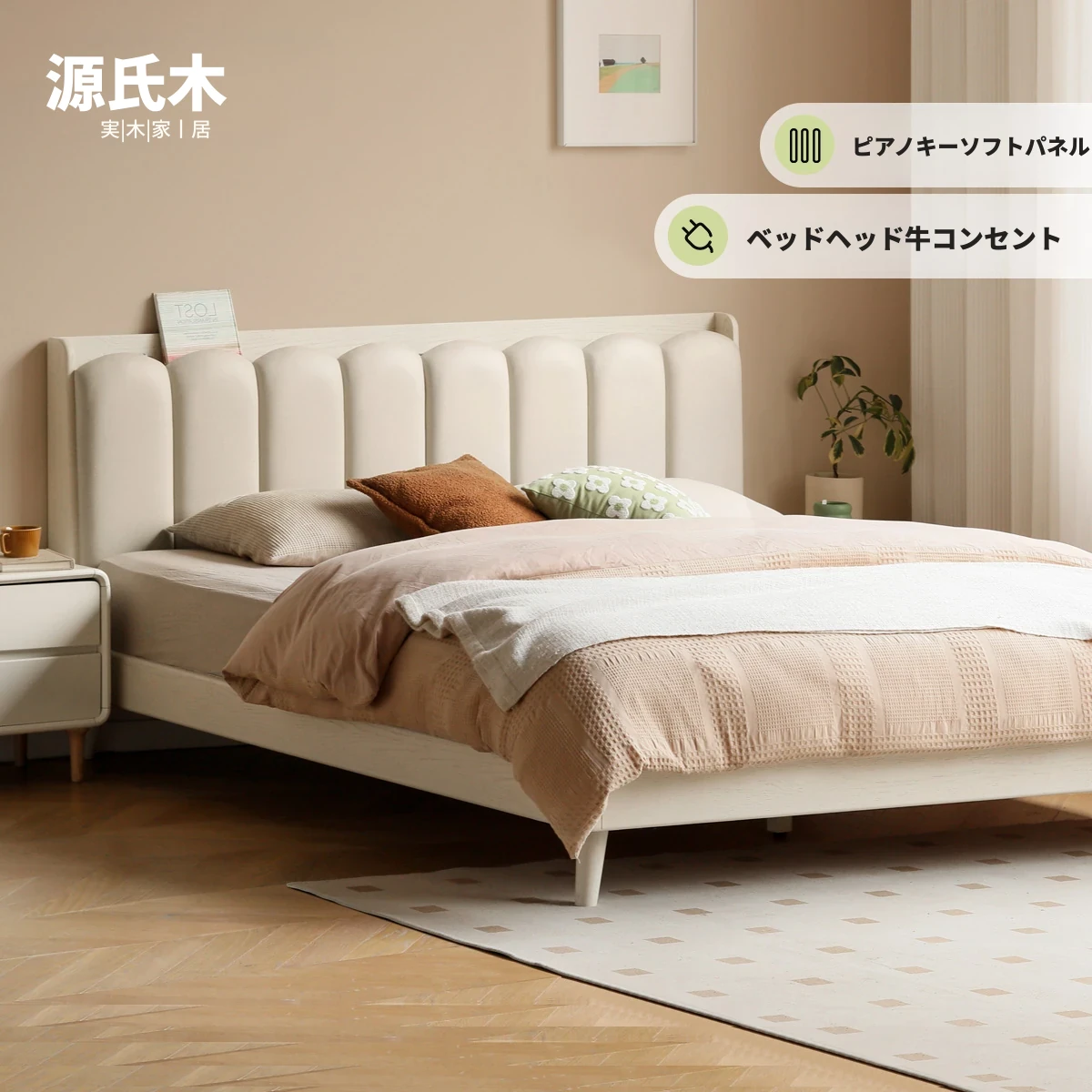 源氏木語の無垢材ベッド|モダンシンプルなダブルベッド|ホワイト浮遊デザイン|大きめクリーム風、スタイリッシュな仕上がりで、快適な眠りを提供します!