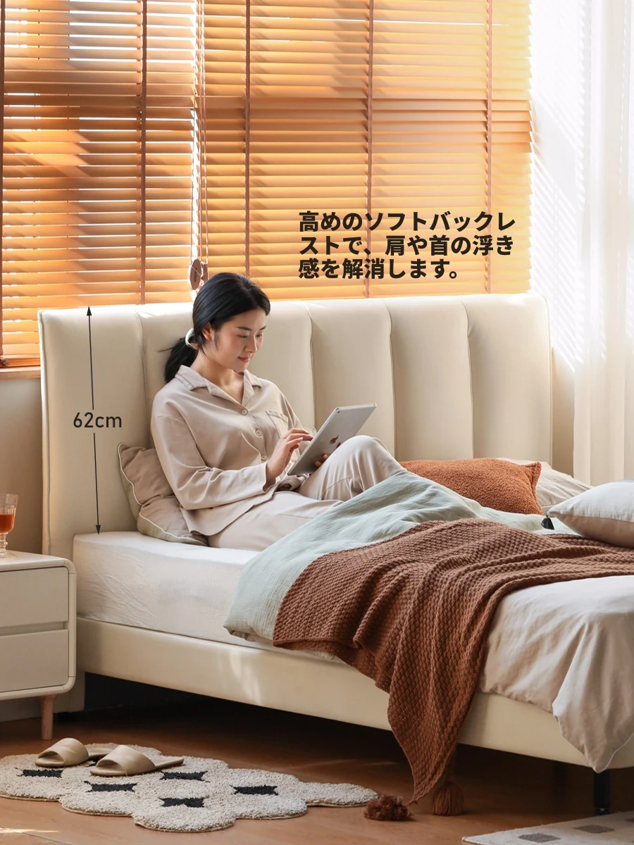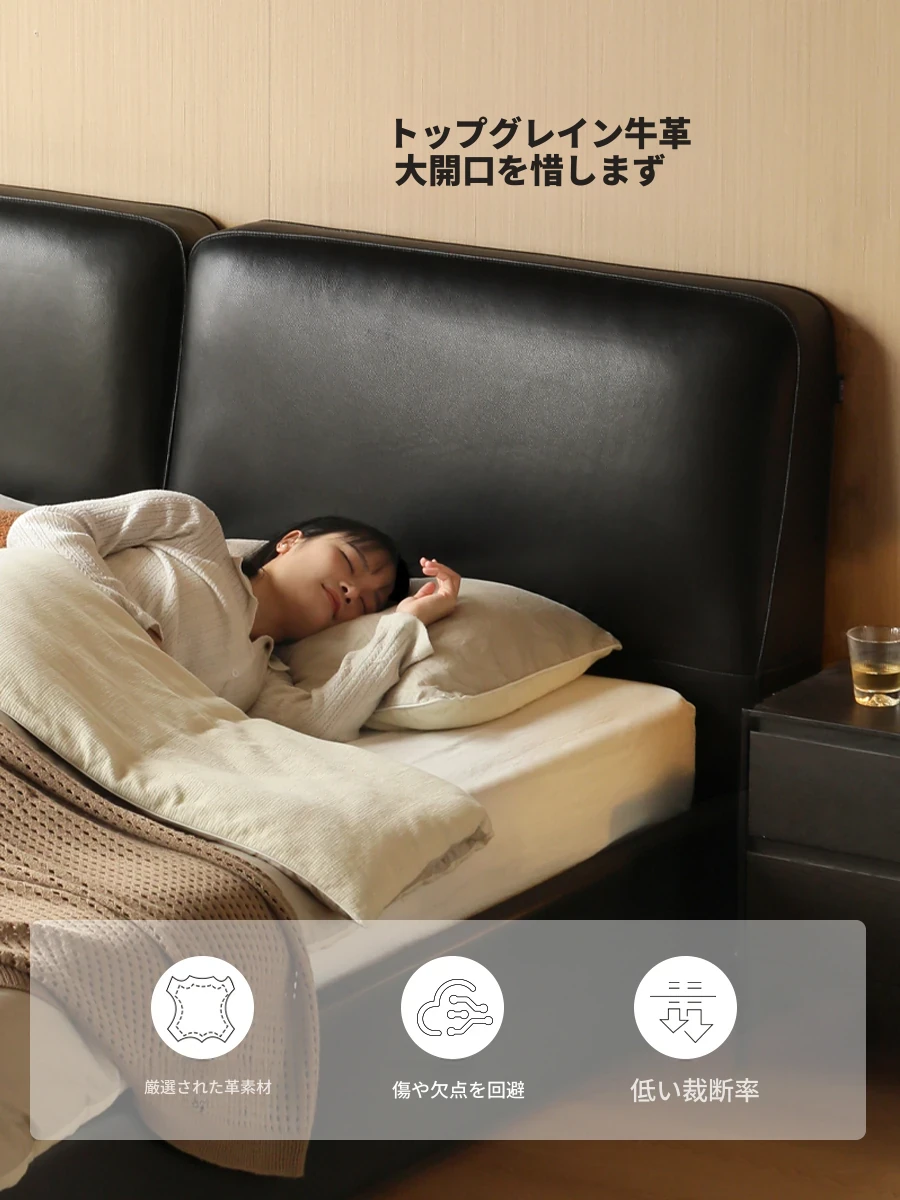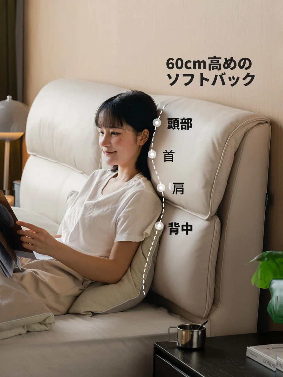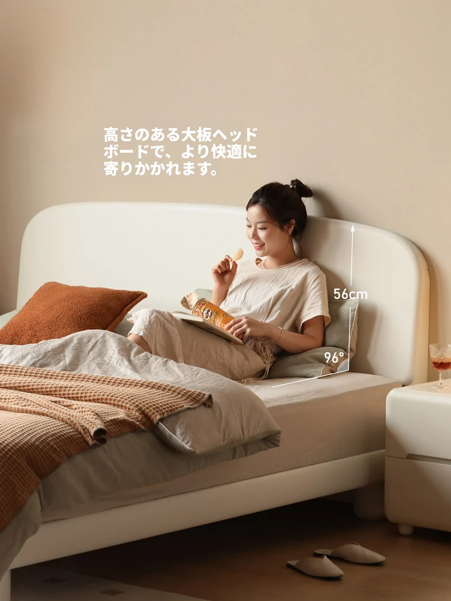 源氏木語の高級本革ベッド - クリーミーな風合いのシンプルなデザイン、かわいい小象の耳付きクッションベッド。主寝室にぴったりなダブルベッドで、心地よい眠りをサポートします。