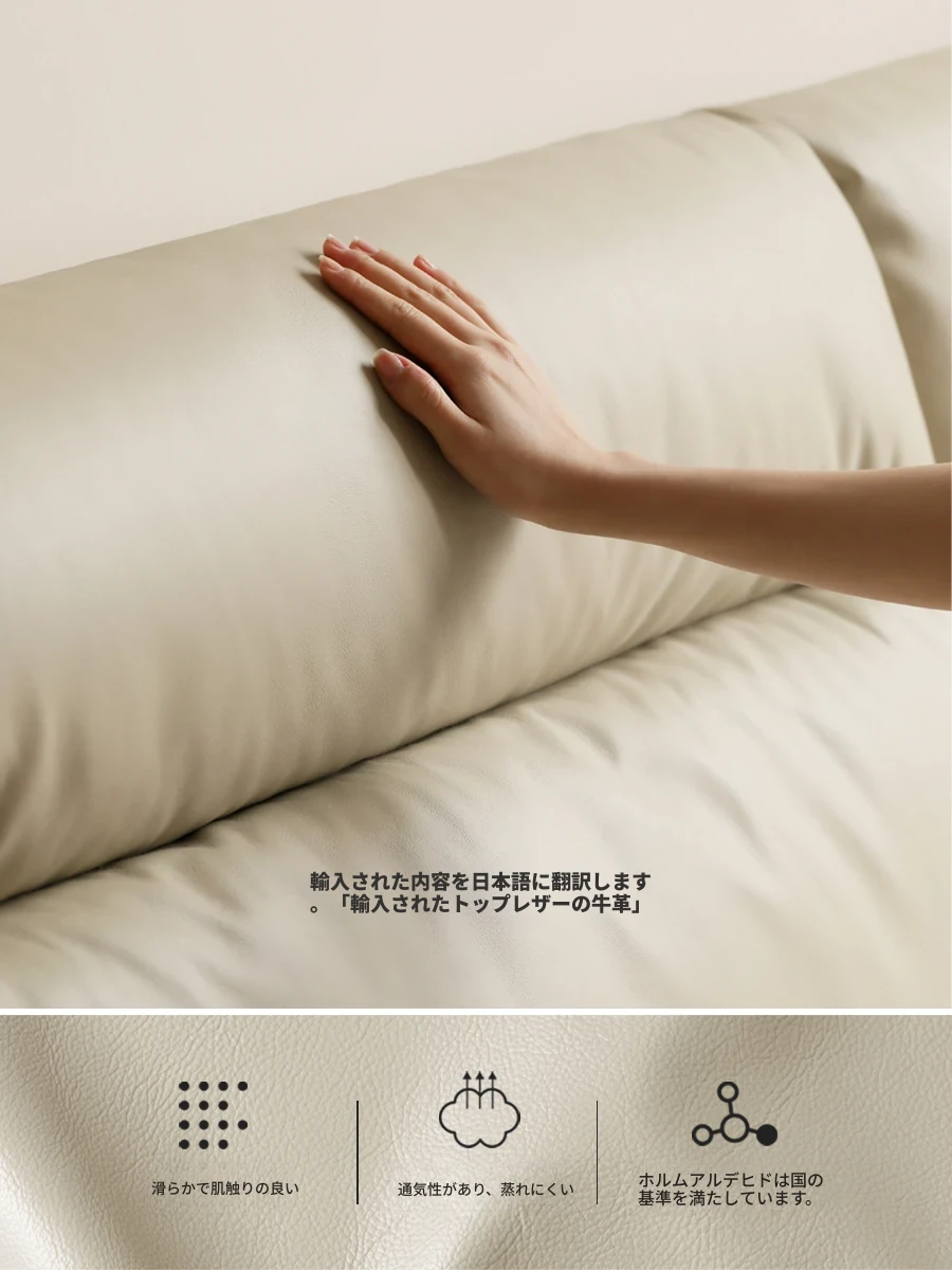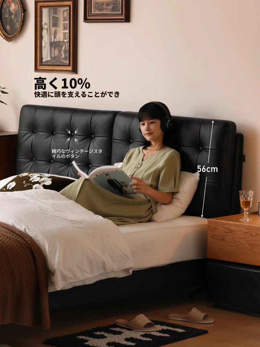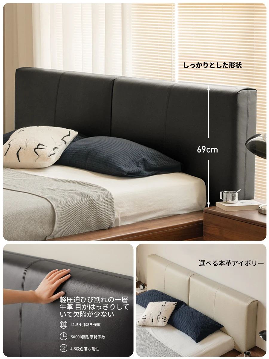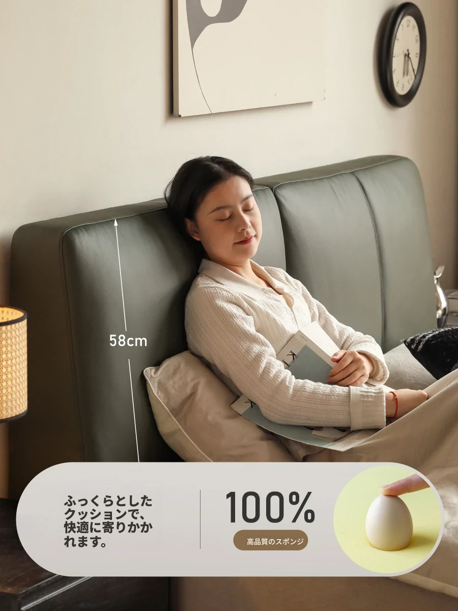 源氏木語の高級本革ベッド - クリーミーな風合いのシンプルなデザイン、かわいい小象の耳付きクッションベッド。主寝室にぴったりなダブルベッドで、心地よい眠りをサポートします。