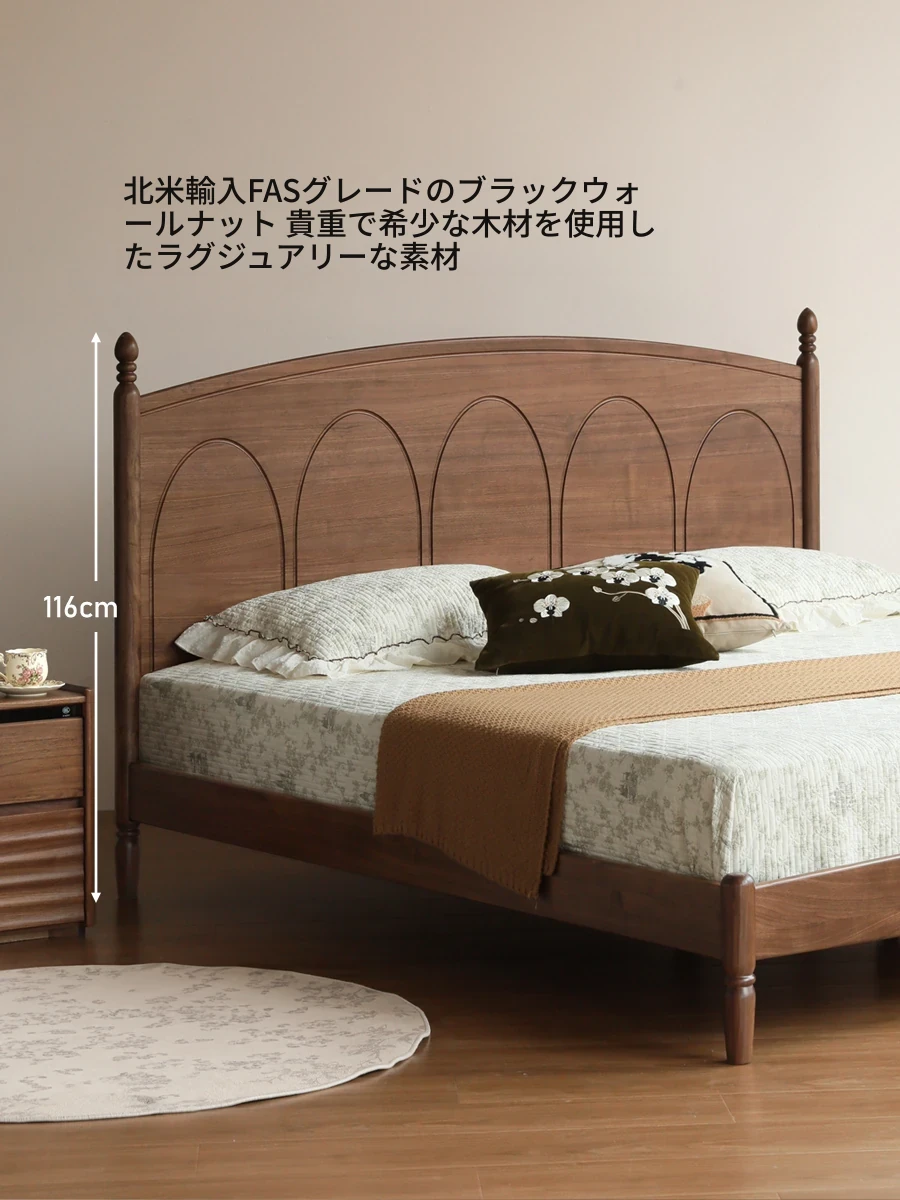 源氏木语の高級パイン材ダブルベッド - フランス風レトロデザインのウォールナット大床、贅沢な寝室家具で心地よい眠りをサポート!