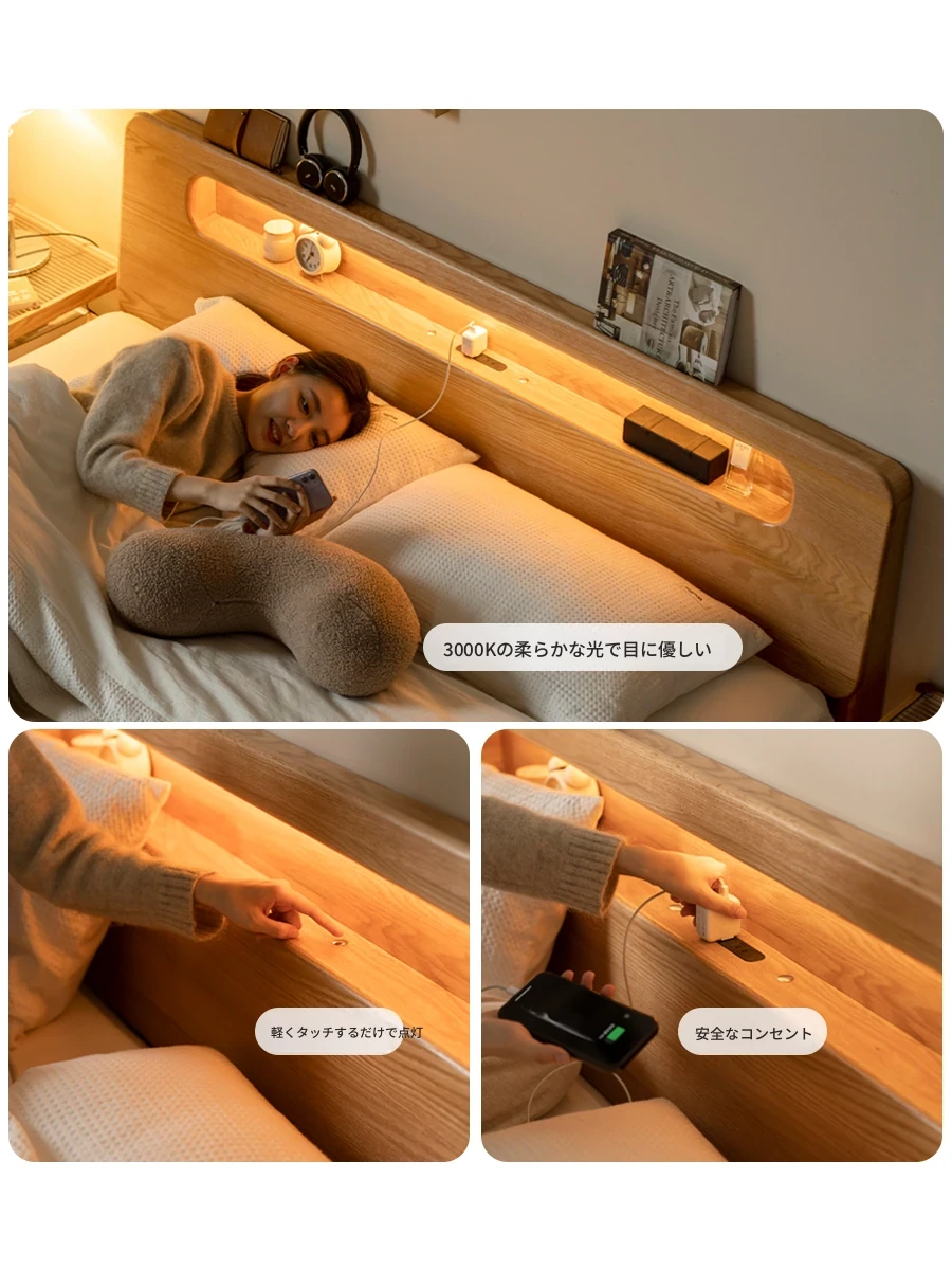 源氏木语の天然木製ベッド - クリーミーな風合いのオーク材フローティングベッド!シンプルでモダンなデザイン、柔らかいファブリックパッケージ。夜間でも優しく光るホワイトの優雅なベッドで、快適な夢の世界へ!