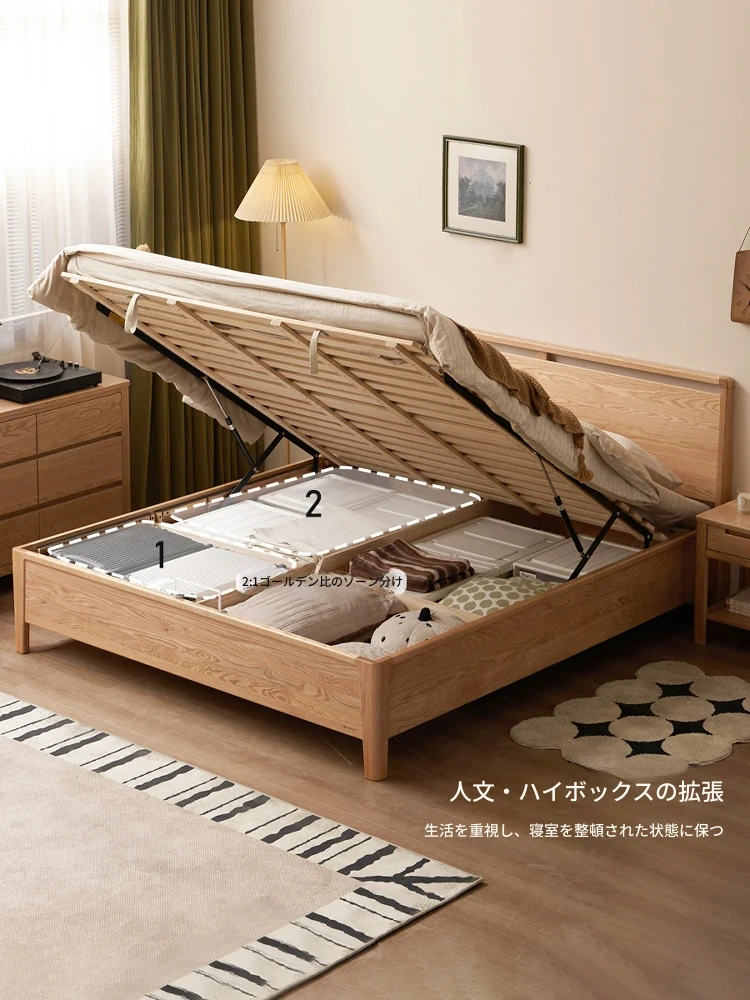源氏木语の無垢材ベッド - モダンでシンプルなオーク材使用、1.5m/1.8mサイズの収納ボックス付き、北欧スタイルのダブルベッドで、快適な寝室空間を実現!
