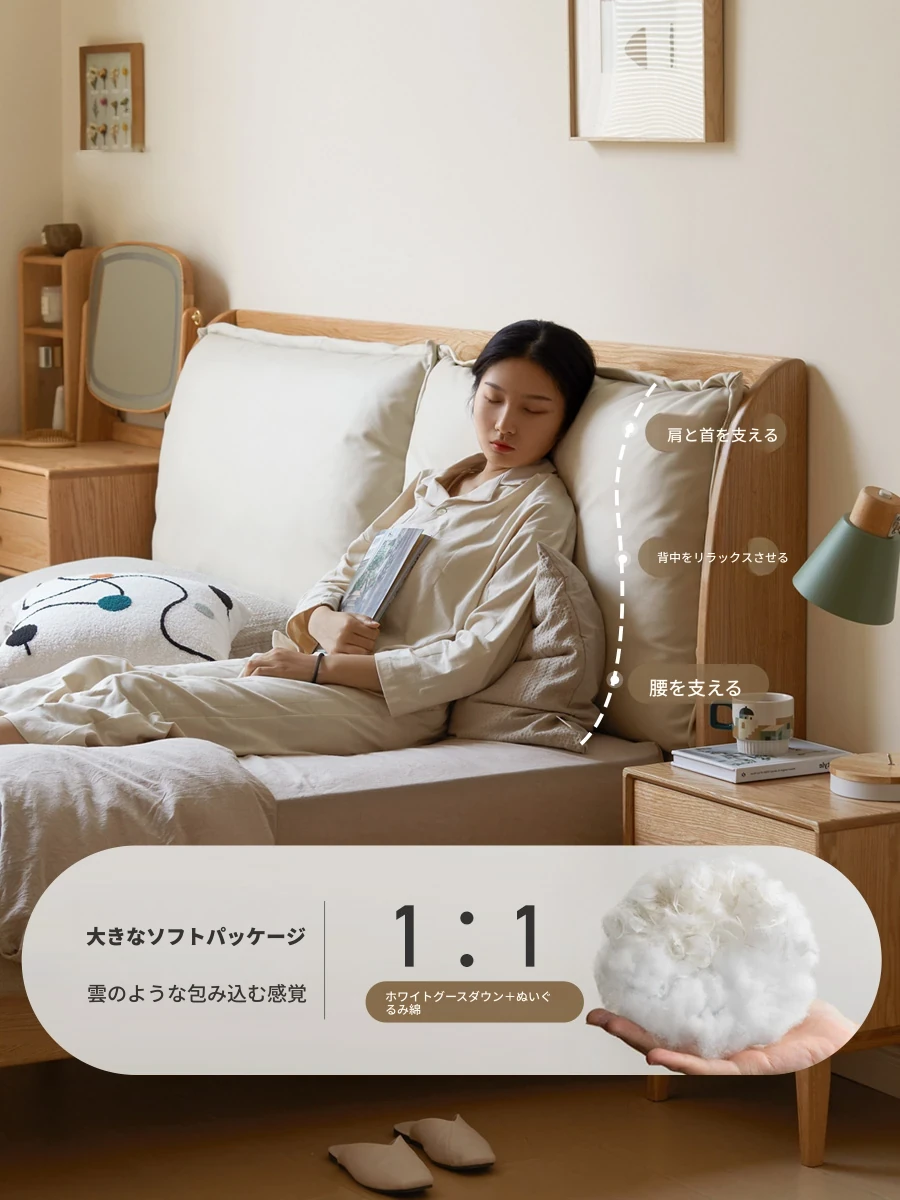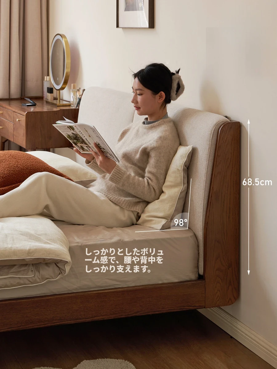 源氏木语ナチュラルウッドダブルベッド - 実用的な収納機能付き、心地よいクルミ色ソファ背もたれが魅力の快適な寝室用ベッド!家庭用に最適、ゆったりとした空間を提供します。