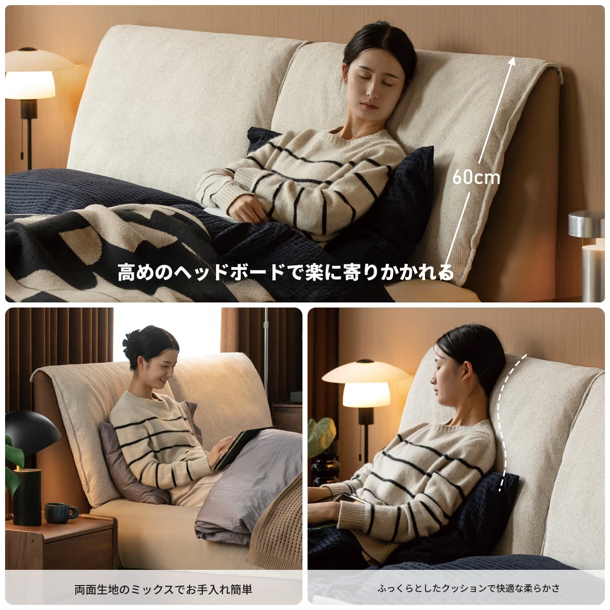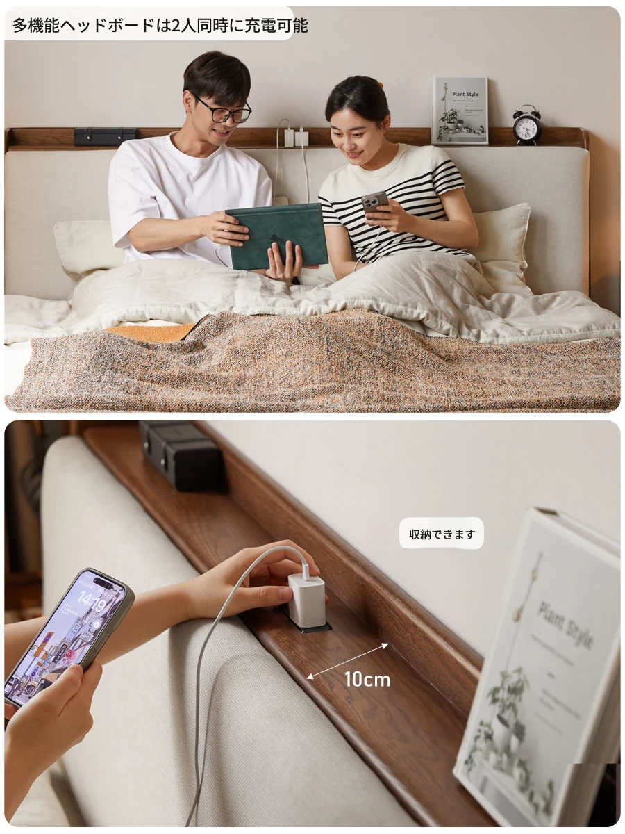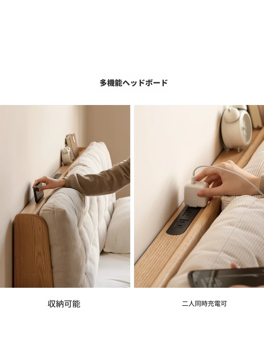 源氏木語の無垢材使用!収納ボックス付きの和風クリームカラー多機能ベッド。贅沢なファブリックヘッドボードで、主寝室をリラックス空間に変身!
