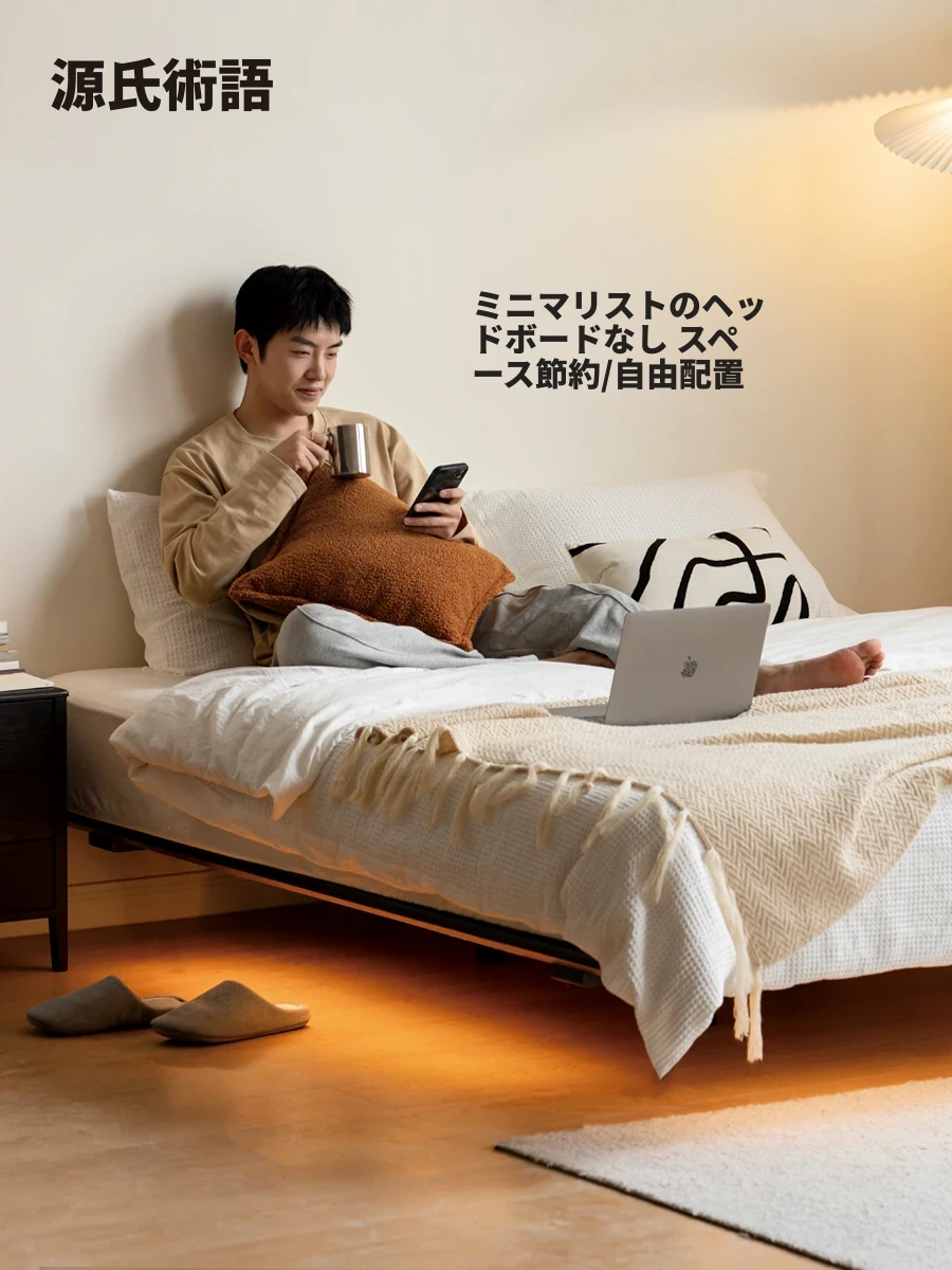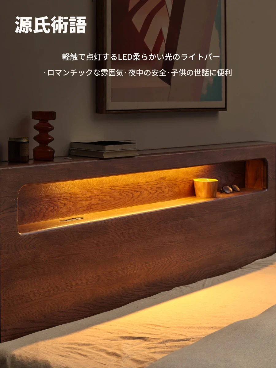 源氏木語の全木製ベッド収納付きモダンシンプルヘッドボード夜光ベッド、浮遊感を感じる理想の寝室空間を演出します。