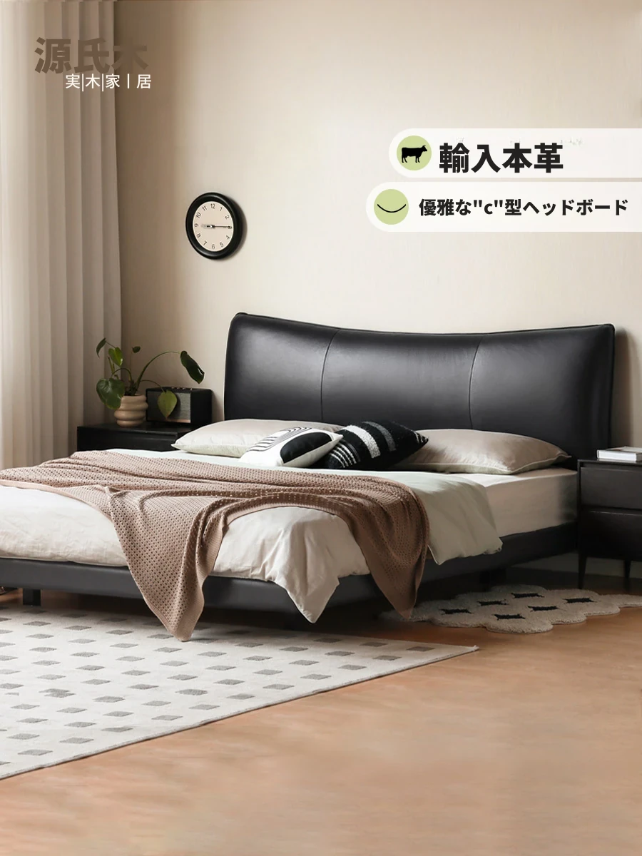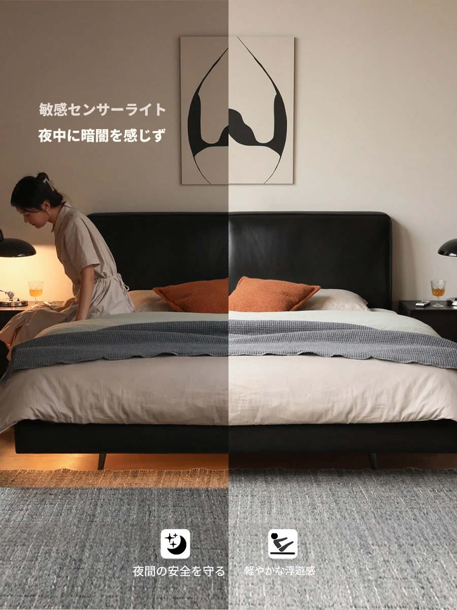 源氏木語の本革製主寝室用ダブルベッド|浮遊感のあるソフトパッケージデザイン|高級感漂うライトラグジュアリーな黒いソフトベッド|快適な眠りを提供!