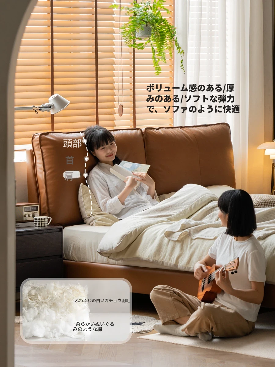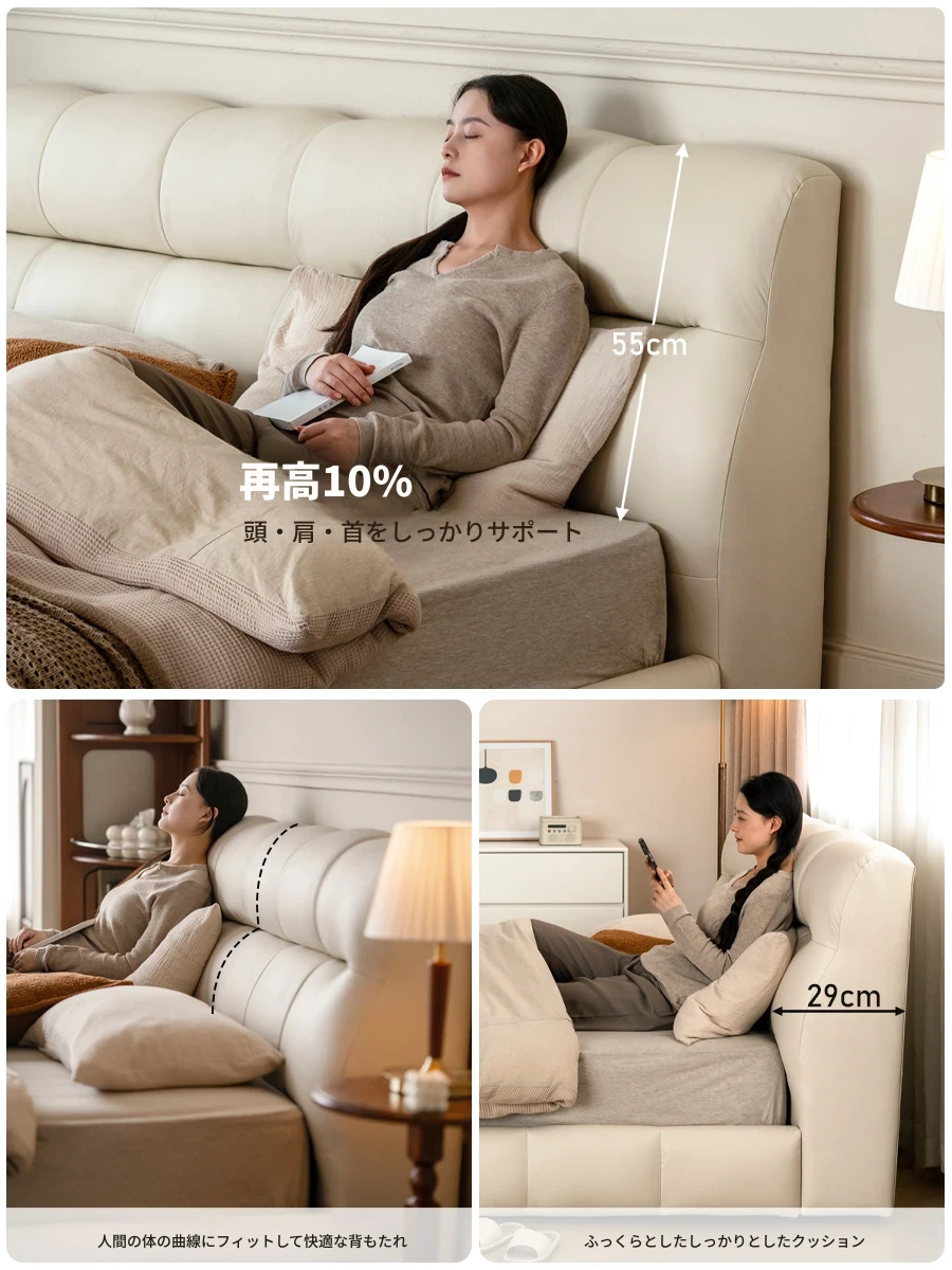 源氏木语 本革製クリーム風ヘッドボード ベッド 小象の耳付き ソフトパッケージ ダブルベッド 主寝室用 政府補助対象商品