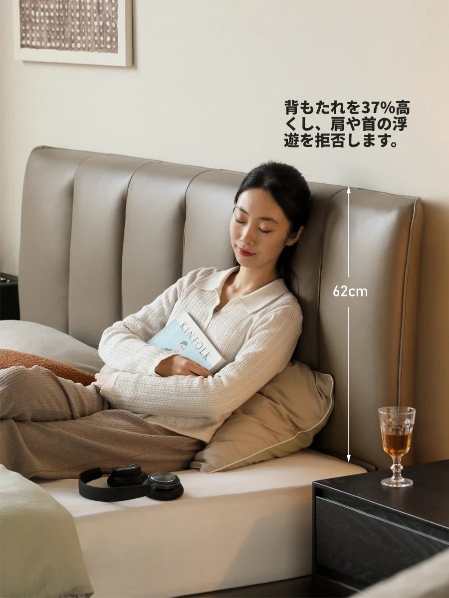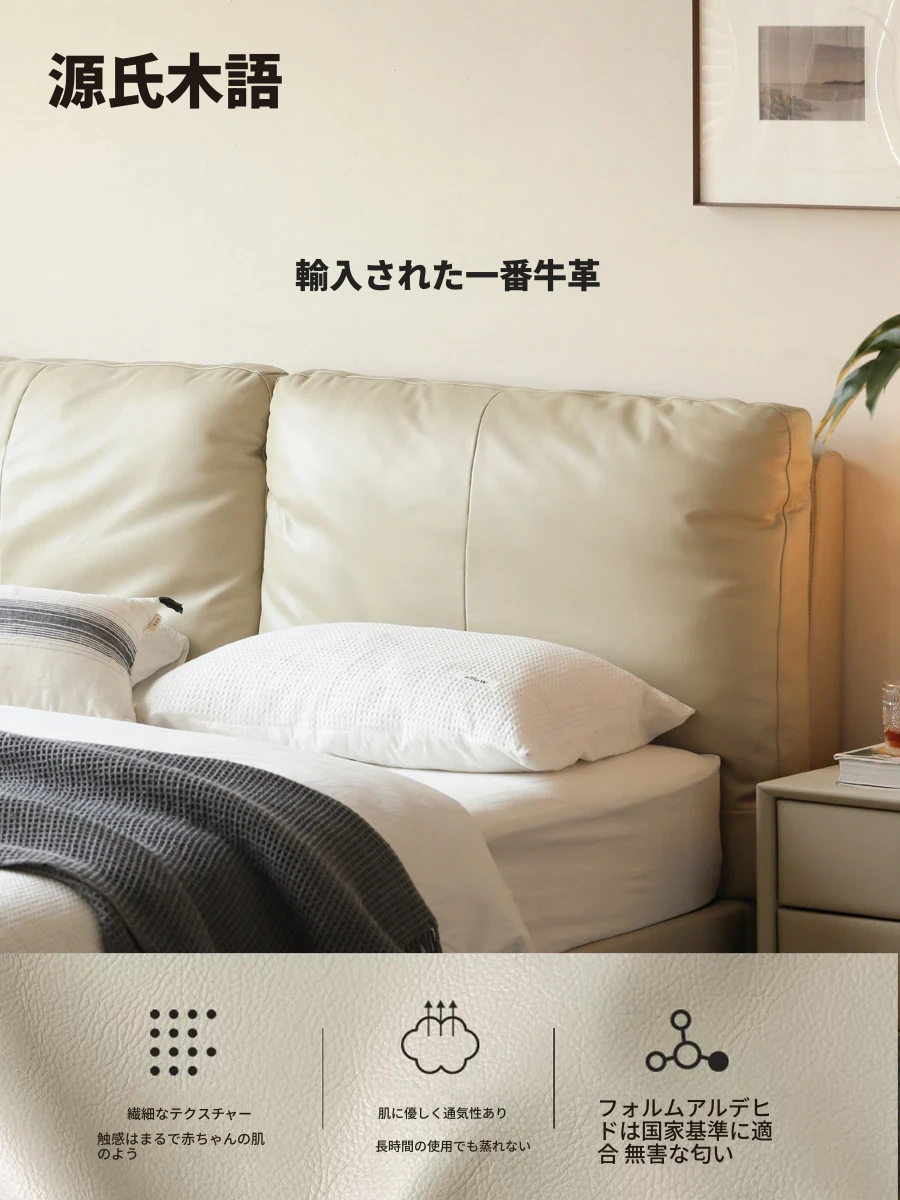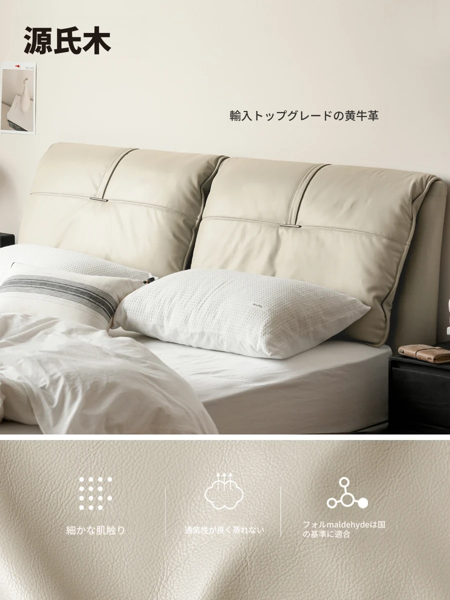 源氏木语 本革使用のクリーム色エレファントイヤーベッド | 高級感溢れる上質な寝心地 | ヘッドレスト付きソフトパッケージ | シンプルで浮遊感のあるデザイン | 寝室にぴったりなスタイリッシュなアイテム