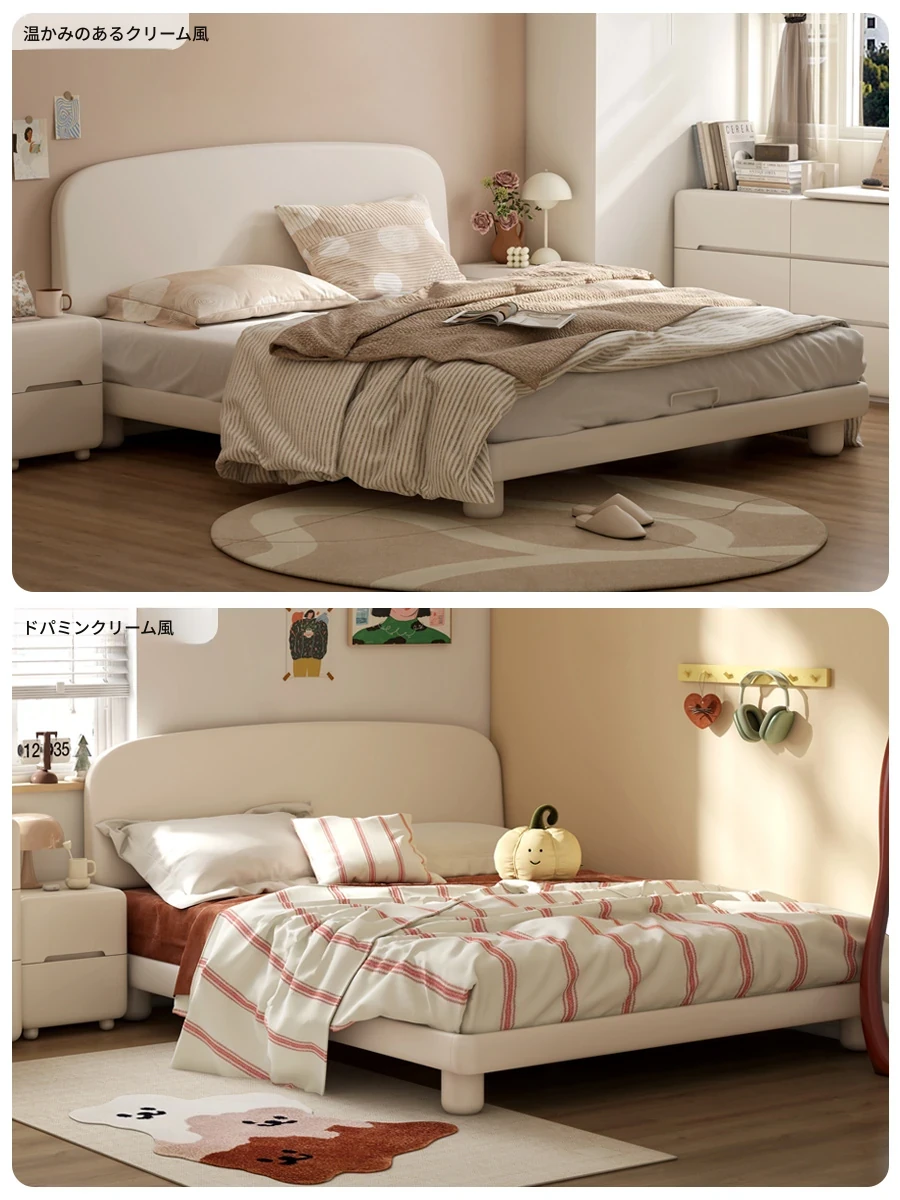 源氏木语天然木製ベッド|クリーミーカラーの柔らかい背もたれ付き|モダンでシンプルなデザイン|ホワイトのフラットベッド|快適なダブルベッドでお家に贅沢な眠りを!