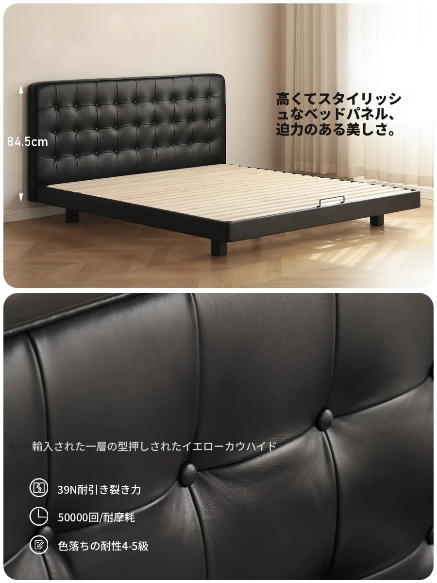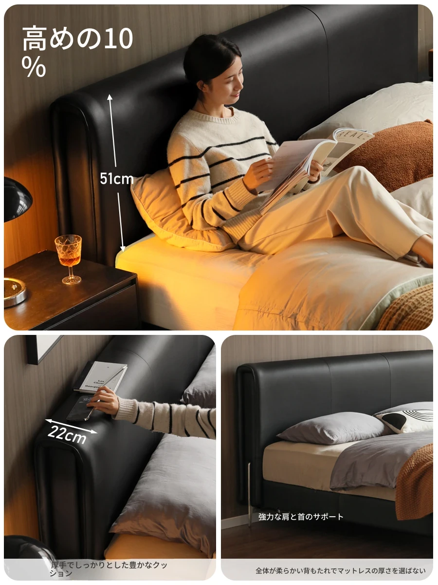 源氏木語 本革仕様 ダブルベッド 大人のためのラグジュアリーな浮遊感 ソフトパッケージ ベッド ブラックレザー スタイリッシュな主寝室に最適