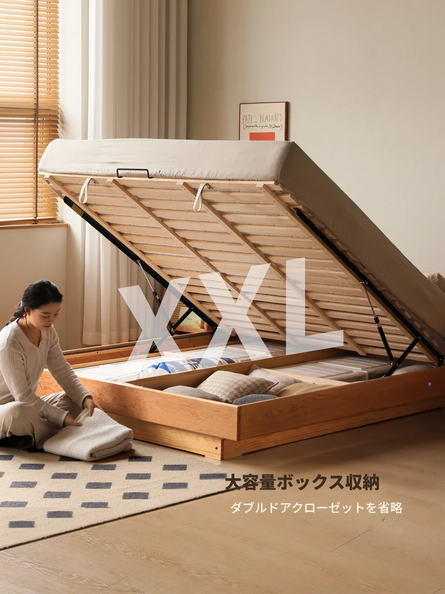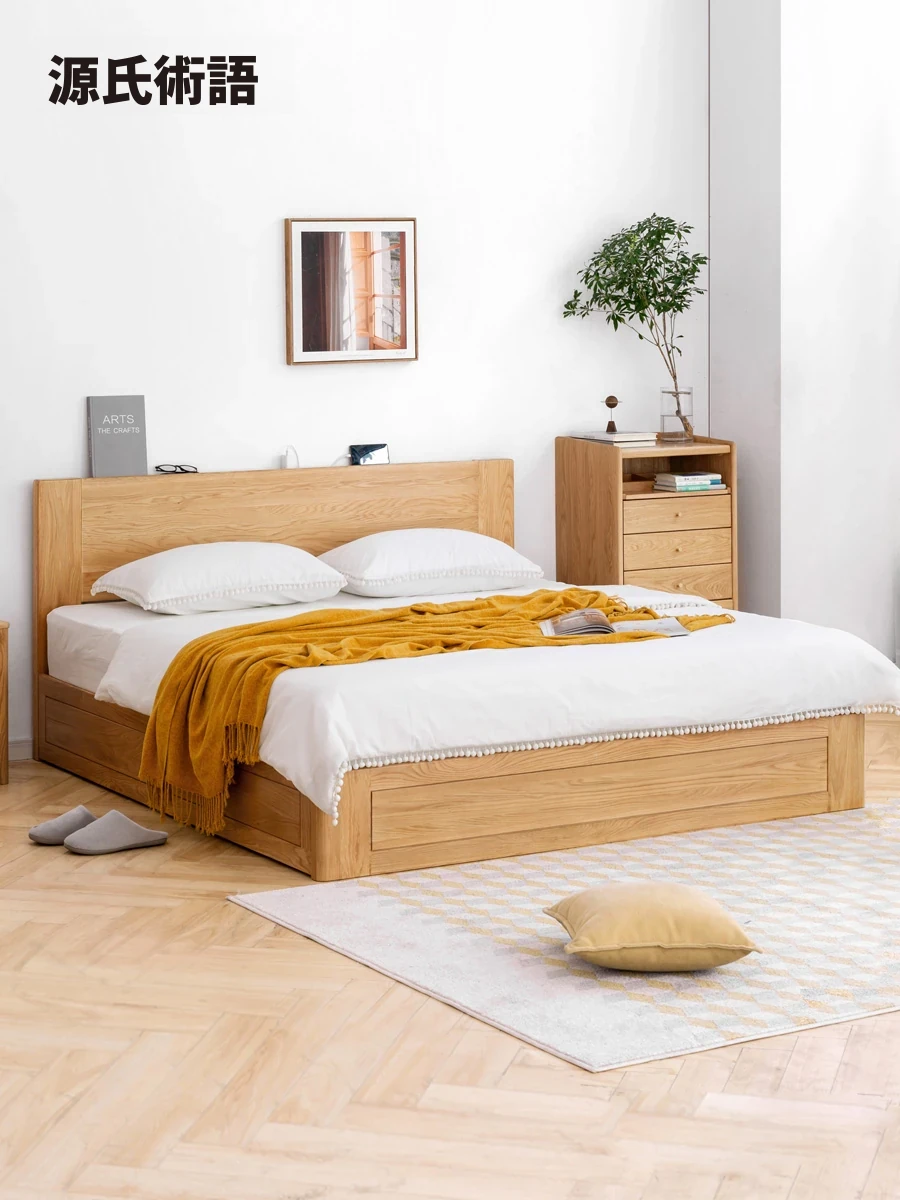 源氏木语 橡木の全木製ベッド モダンシンプルデザイン 高箱収納機能付き 北欧スタイルのダブルベッド 寝室に最適な家具で、快適な睡眠空間を提供します!