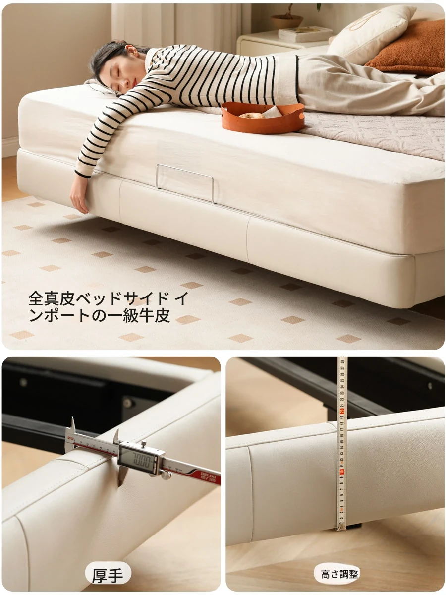 源氏木語のタタミベッド - 本革使用のクリーム色フラットベッド!小型住まいに最適な現代的でシンプルなデザイン、ヘッドレスの浮遊感を楽しんで、快適な睡眠を実現します。