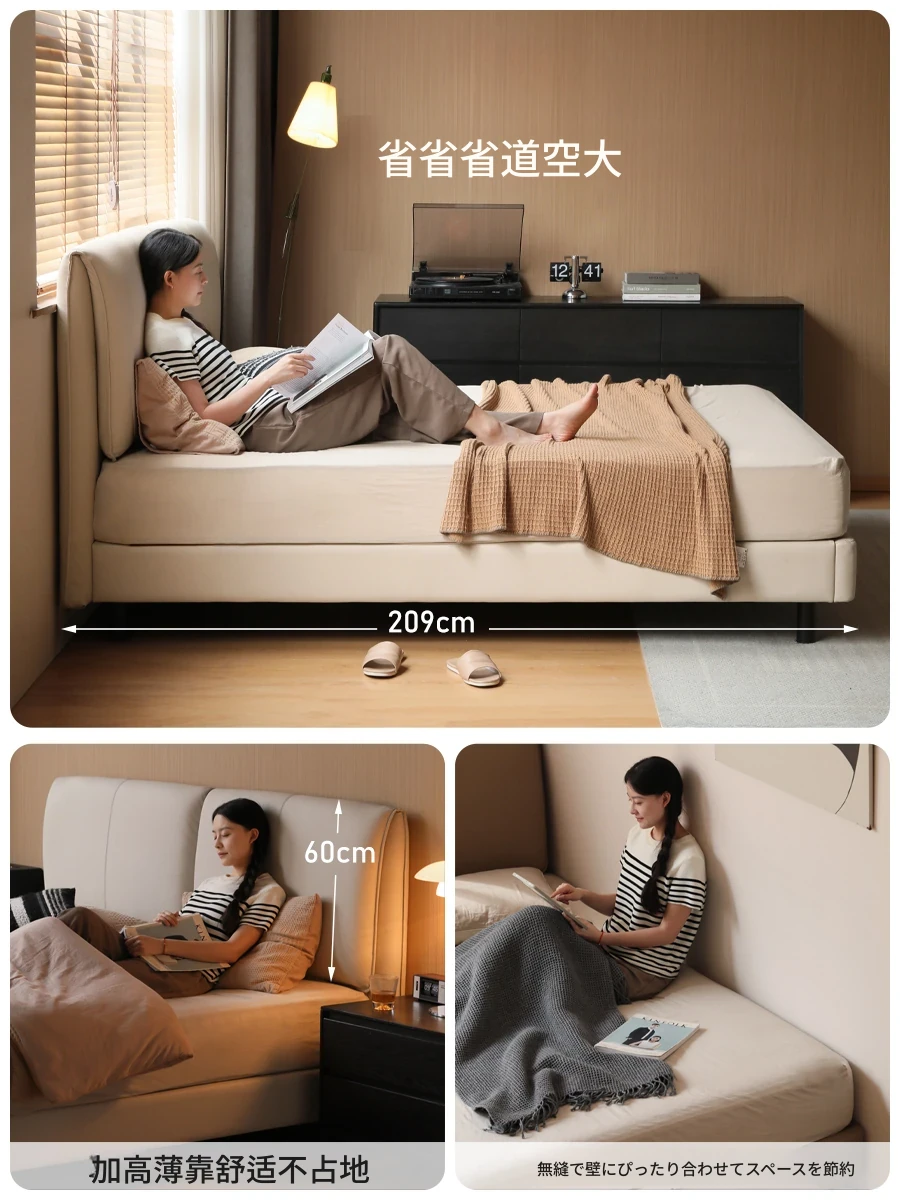 源氏木语スロープソファベッド|小型住宅に最適なやわらかいファブリック製、クリーム色のLOFTスタイルダブルベッド、和モダンデザインで快適な眠りを!