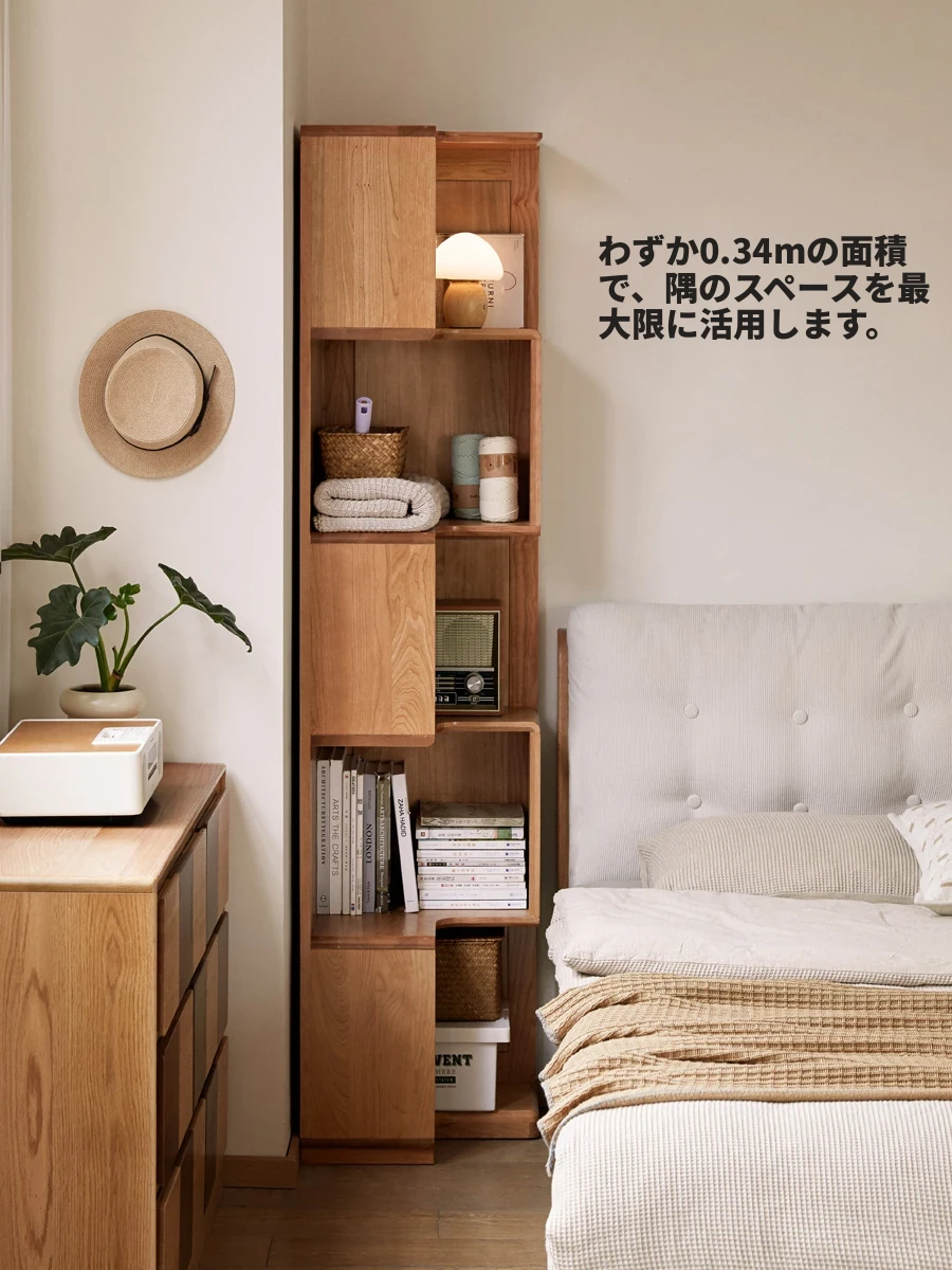 源氏木語 本格的な無垢材のコーナー書棚 リビングに最適な床置き収納チェスト 中古風のチェリーウッド製 壁際にフィットするコーナー収納キャビネット