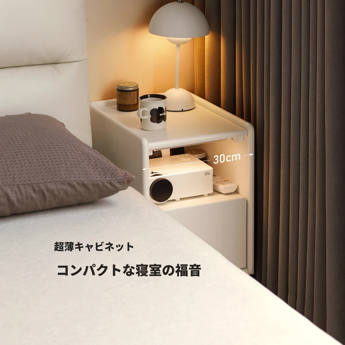 源氏木語 天然木製ナイトテーブル | クリーム風のスリムデザイン | 小スペースに最適な白いシンプルなベッドサイドキャビネット | ライト付きの便利なおしゃれ収納です。