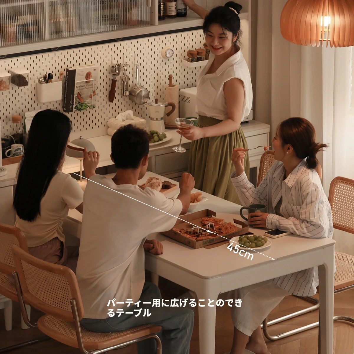 源氏木语の無垢材を使用した、洗練されたフレンチクリームスタイルの一体型アイランドダイニングテーブルと多機能ティーサーバー付きサイドボード - 美しい白色仕上げで、あなたの食卓を華やかに演出します!