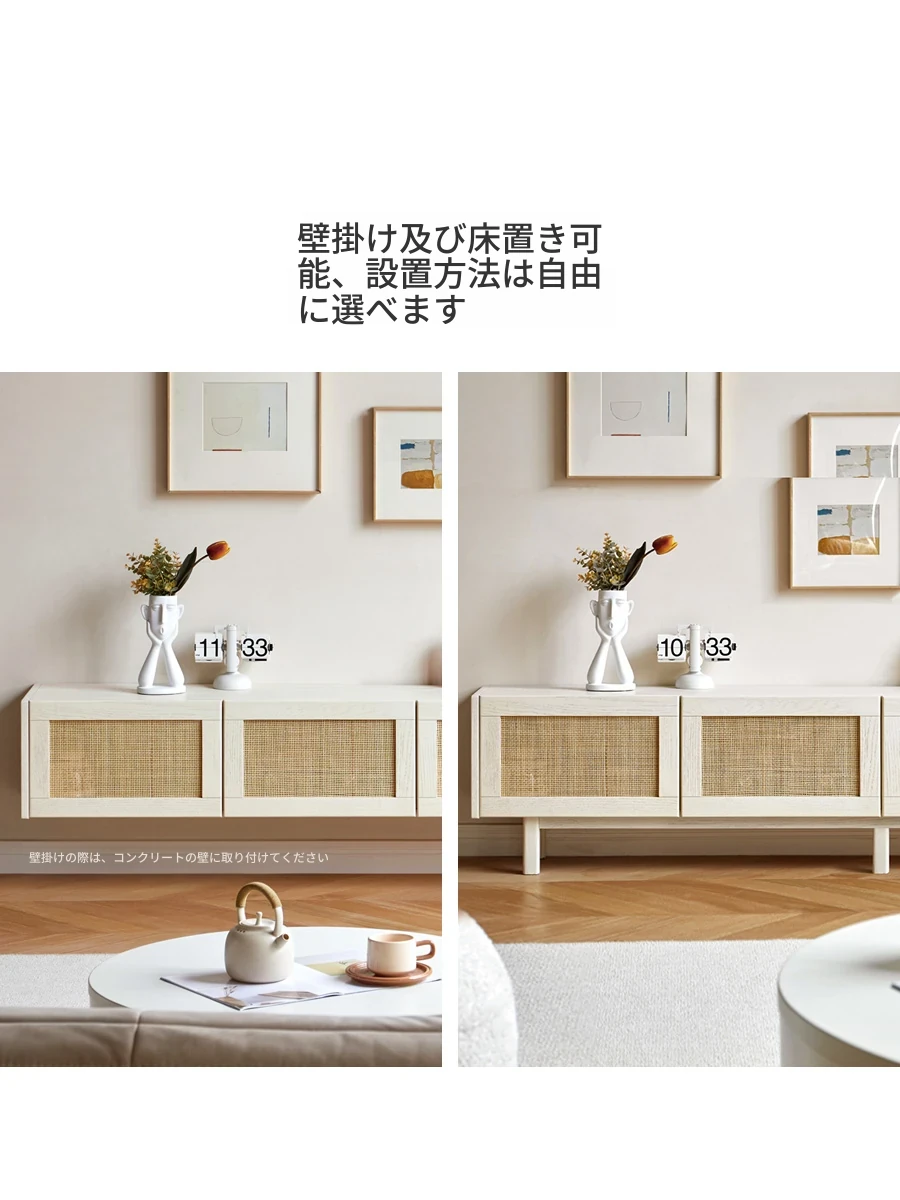源氏木語 全実木の浮遊式テレビキャビネット シンプルなリビングに最適 藤編の床台とクリーム風のオーク材 白色収納キャビネットで心地よい空間を演出!