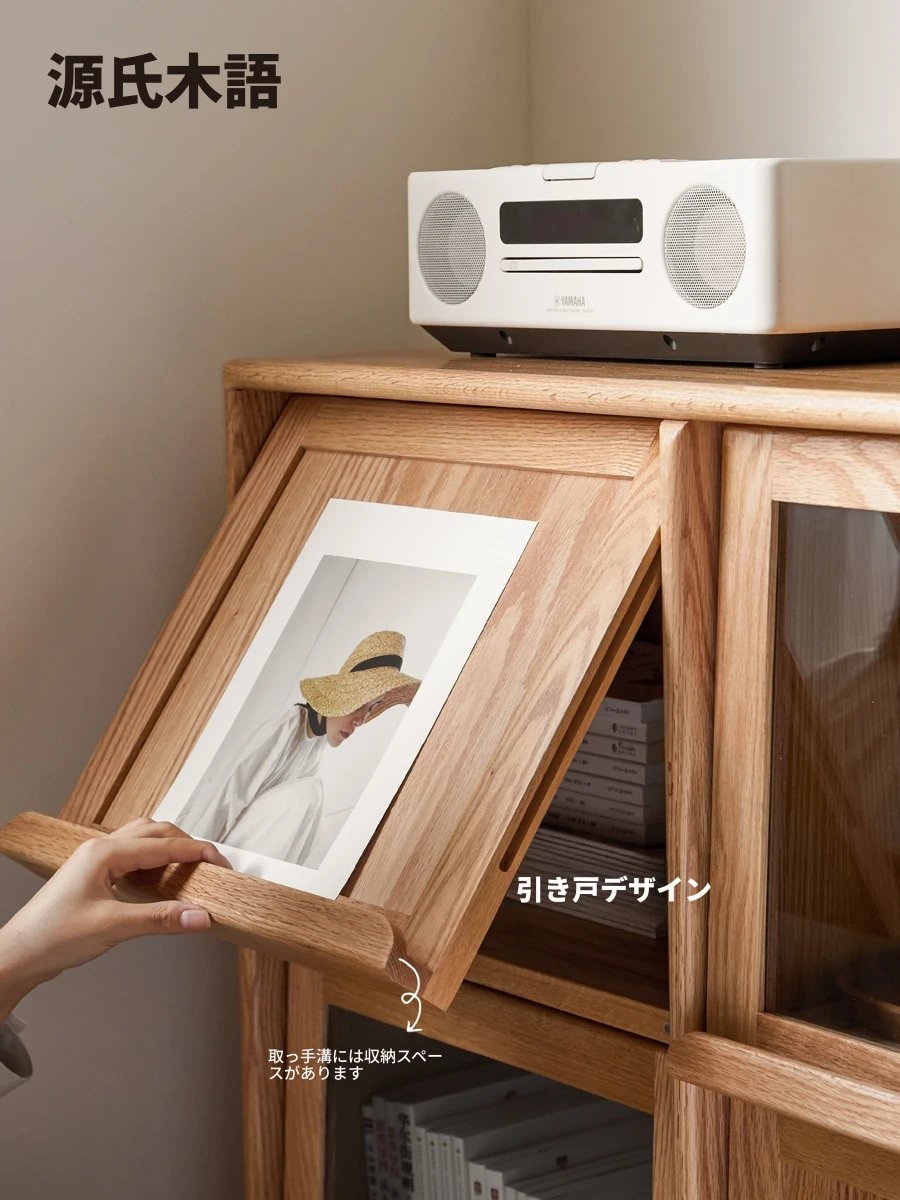 源氏木语スリムデザインの無垢材サイドボード 高さのある多機能収納キャビネット 一人暮らしに最適な壁寄せ収納付き