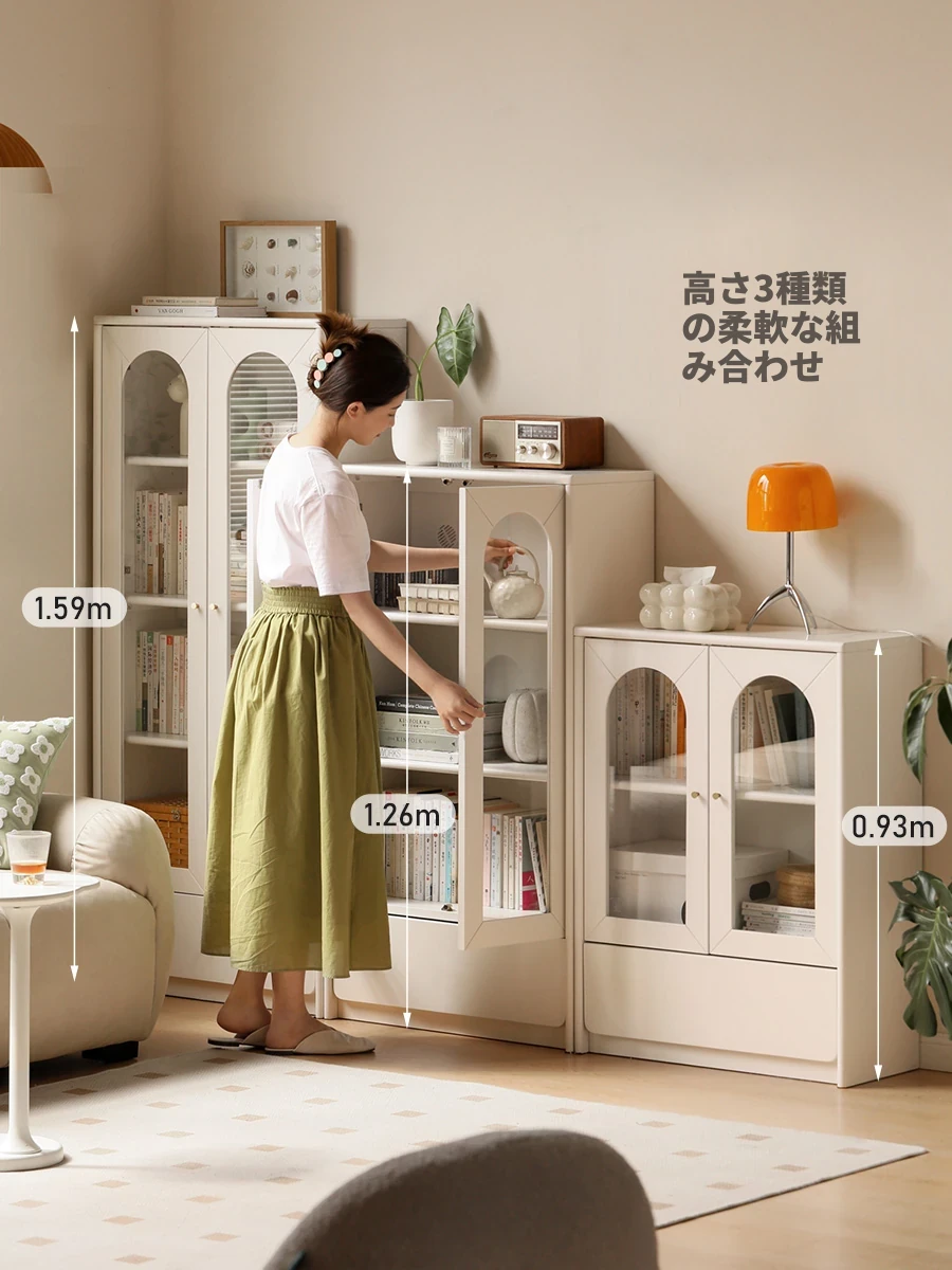 源氏木语の天然木製フロア書棚 - ドア付き収納ラック、フランス風クリームカラーでおしゃれに整理整頓!本や装飾品を美しく展示できる多機能キャビネット。