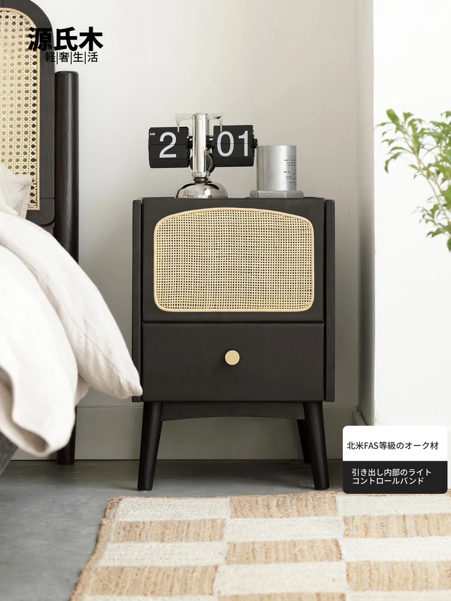 源氏木语の全実木製ナイトテーブル|モダンなラタン編み引き出し収納|北欧シンプルデザイン|ブラックオークのベッドサイドキャビネットで寝室をスタイリッシュに演出!