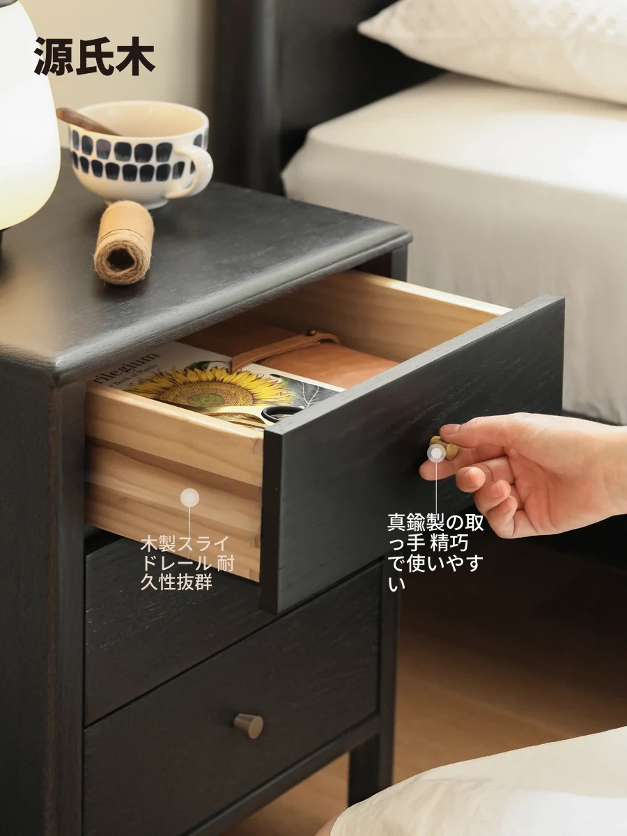 源氏木语のシンプルでヴィンテージ感あふれる無垢材ベッドサイドテーブル - アメリカンスタイルのオーク製黒色収納キャビネットで、あなたの寝室をおしゃれに演出!