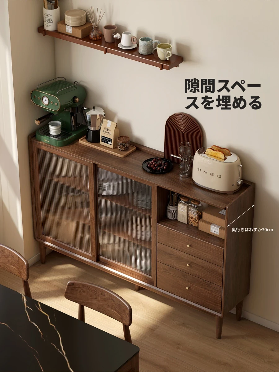 源氏木語 モダンな無垢材ダイニングサイドボード - ブラックウォールナットの小型ガラス収納キャビネット、シンプルでスマートな家用収納、狭いスペースにもぴったり!