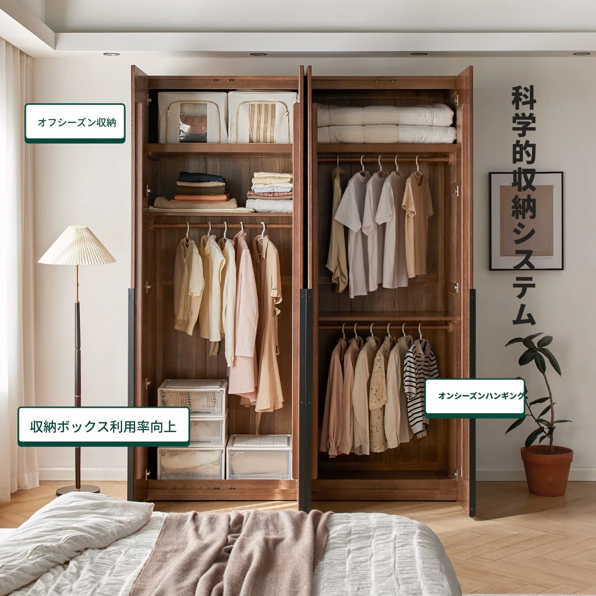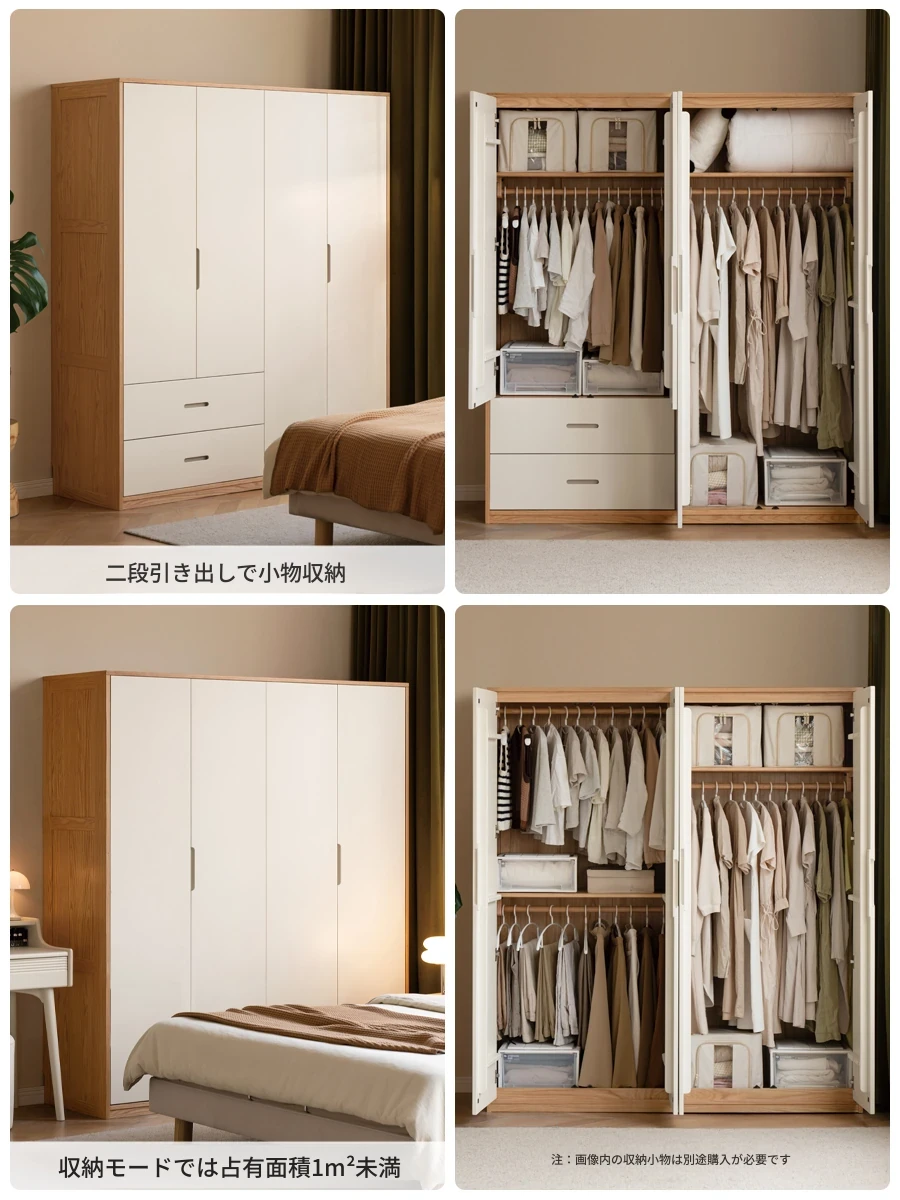 源氏木语プレミアム無垢材クローゼット!ベッドルームにぴったりなクリーミーウッド調の両開き収納キャビネット。スタイリッシュで機能的なフロアスタンドのコンビネーションキャビネットで、あなたの収納力をアップ!