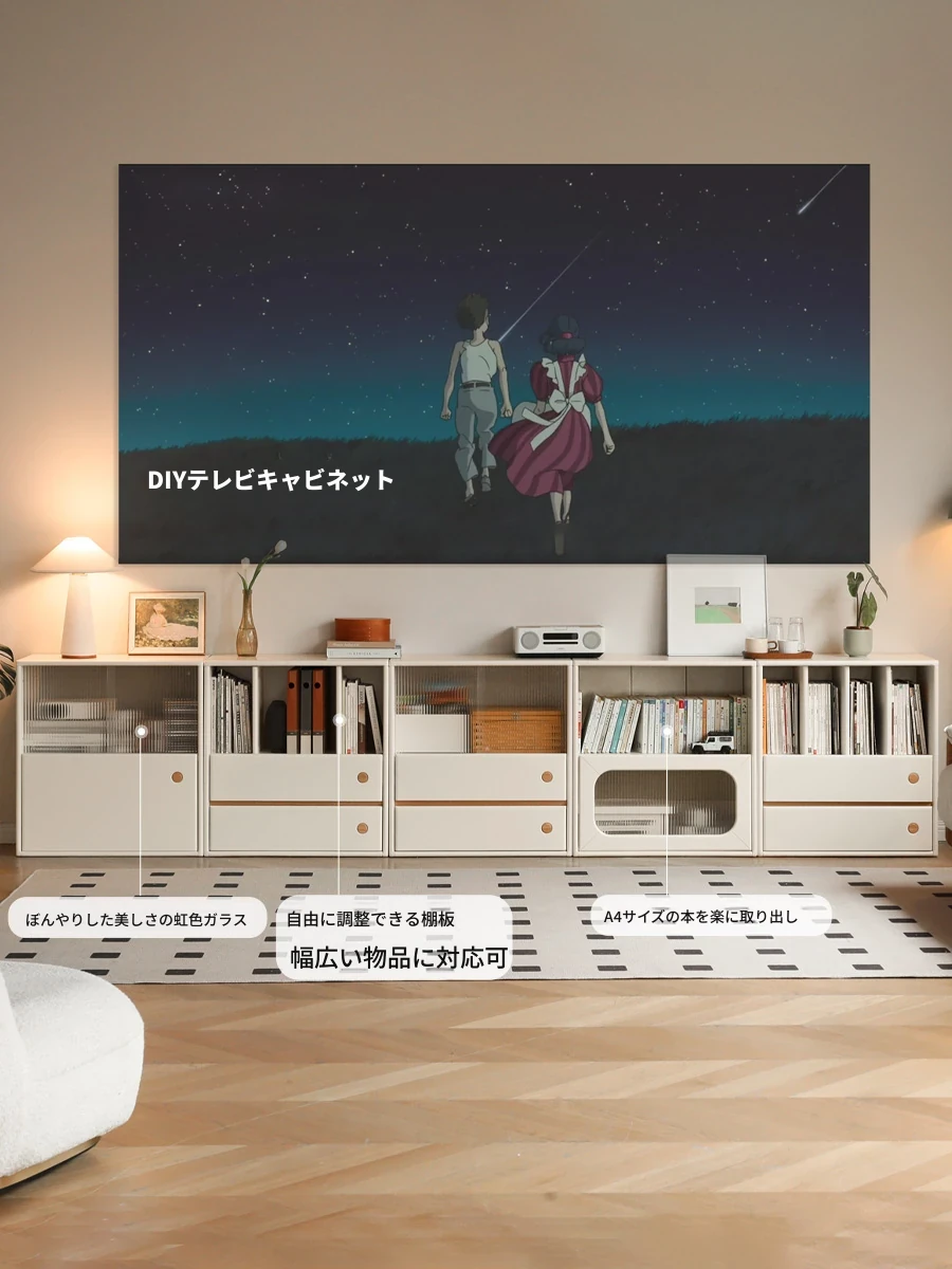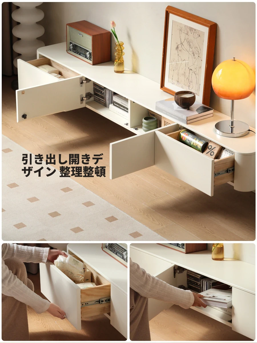 源氏木语の無垢材フローティングテレビキャビネット - おしゃれなリビングにぴったり!収納力抜群で、クリーミーな風合いの空間を演出。お部屋をスッキリさせる、魅力的なデザインの一体型収納家具です。