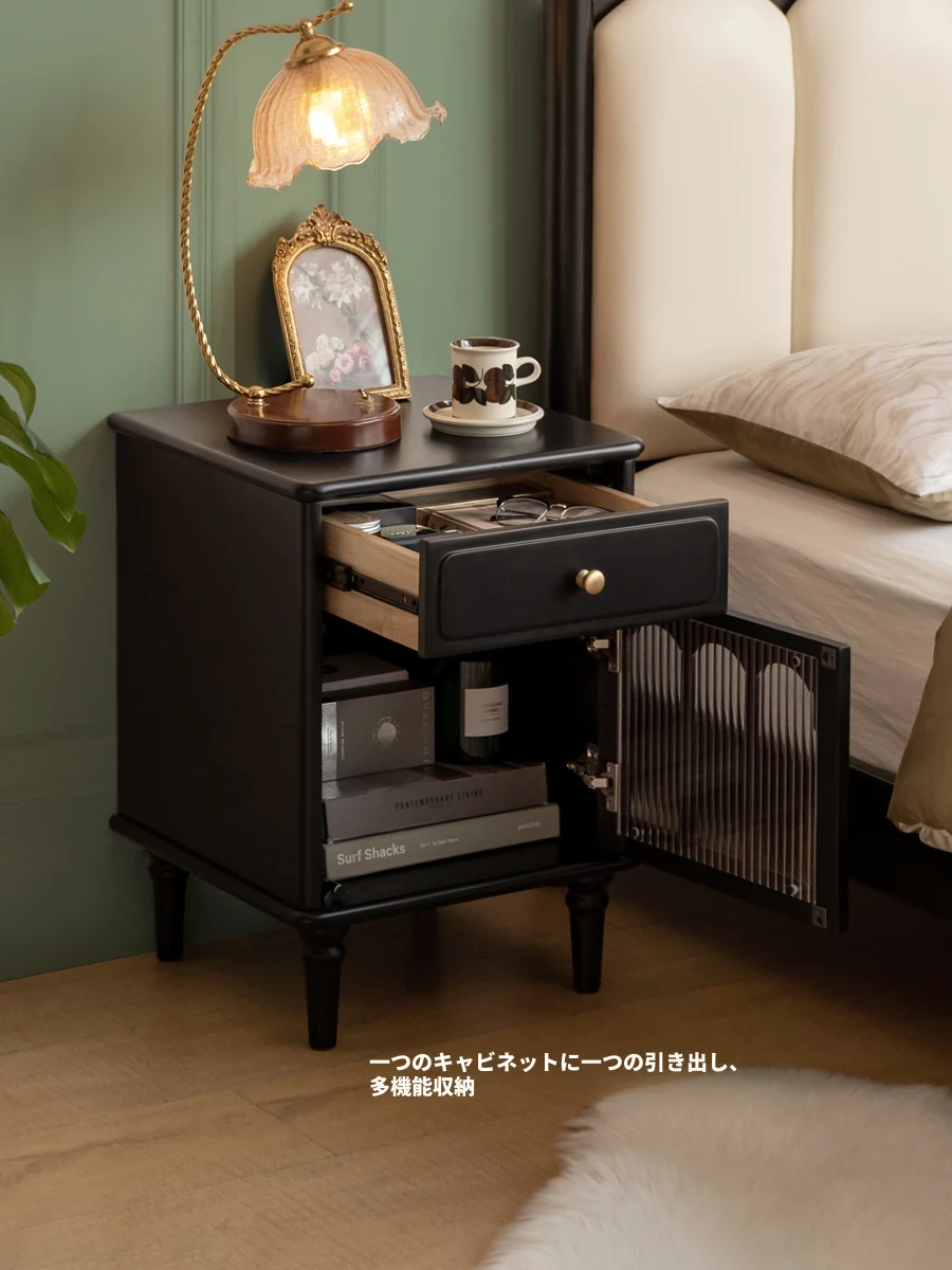 源氏木语 フランス風ヴィンテージデザインの無垢材ナイトテーブル - おしゃれで機能的なブラック収納キャビネット、寝室やリビングにぴったりな小型家具!