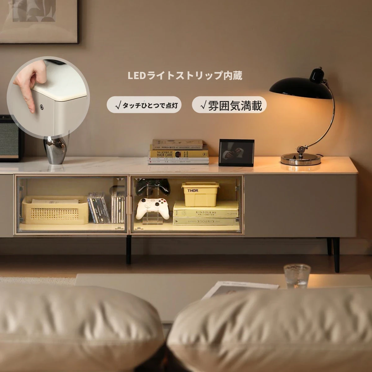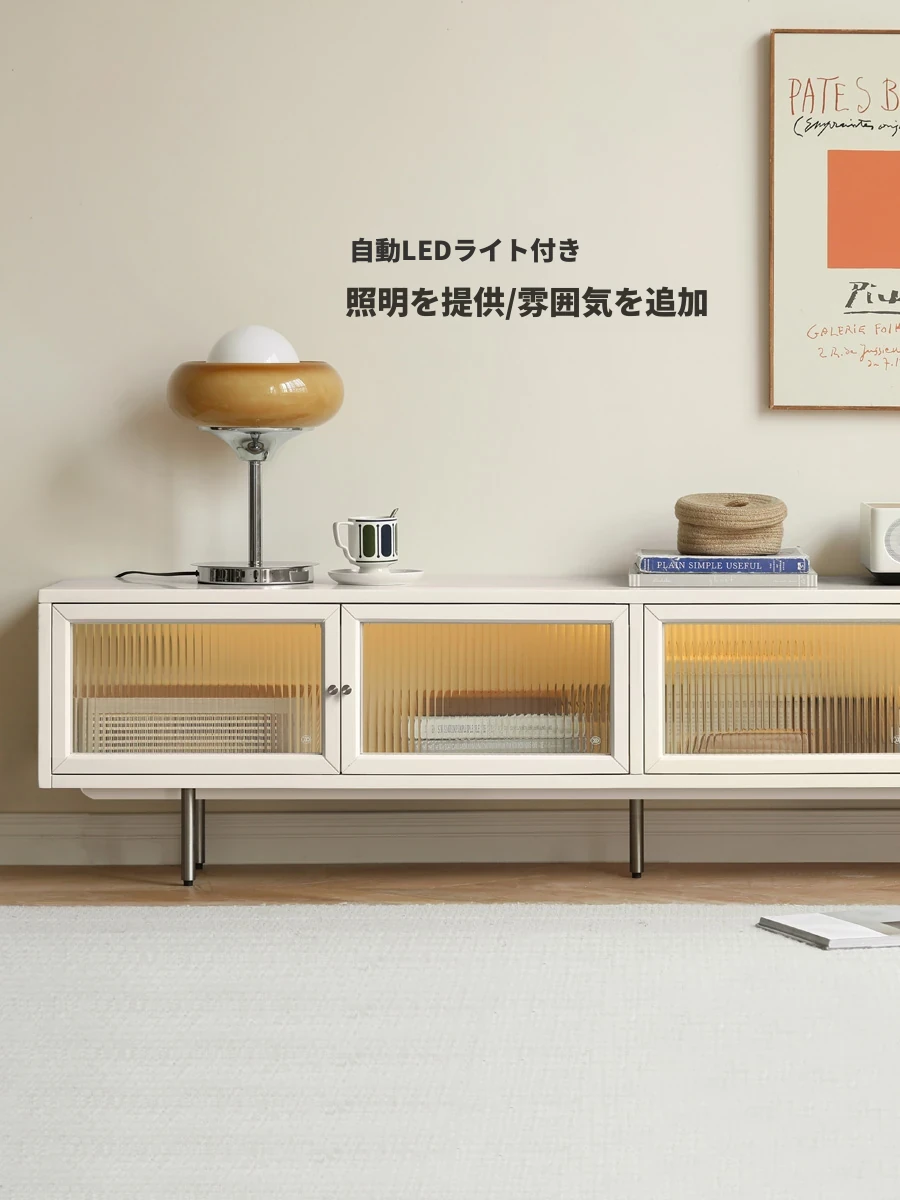 源氏木語の実木テレビキャビネット|モダンミニマルなデザインの大容量収納|クリームカラーのライト付きドロワーキャビネットでお部屋をおしゃれに演出!