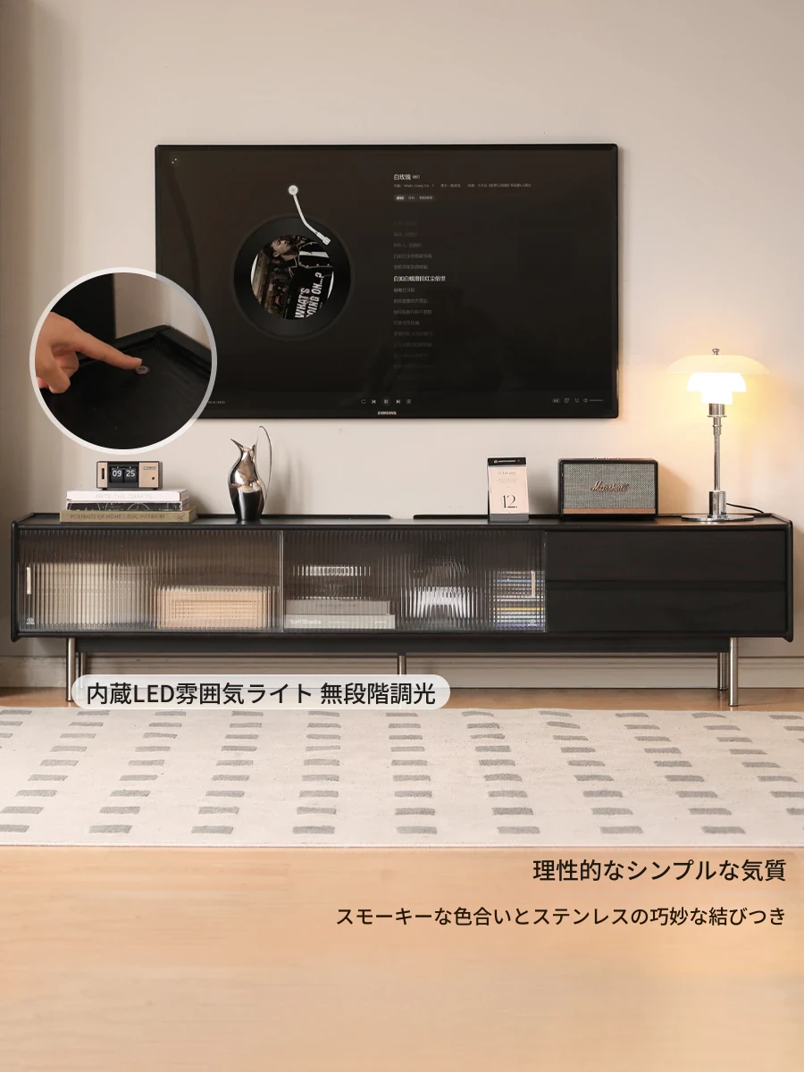 源氏木语天然木製テレビカウンター | シンプルでスタイリッシュなリビング用収納キャビネット | フレンチヴィンテージスタイルの黒いガラススライドドアダイニングキャビネット