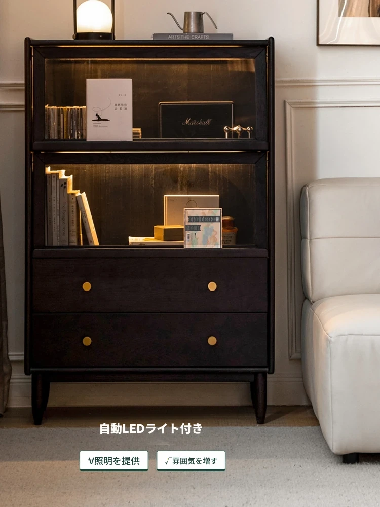 ガラス扉付きの本格木製書棚 - 照明便利なディスプレイキャビネット!リビングルーム全体を活かす収納力抜群の一体型デザイン。おしゃれで使いやすい、家族のための理想的な収納ソリューション!