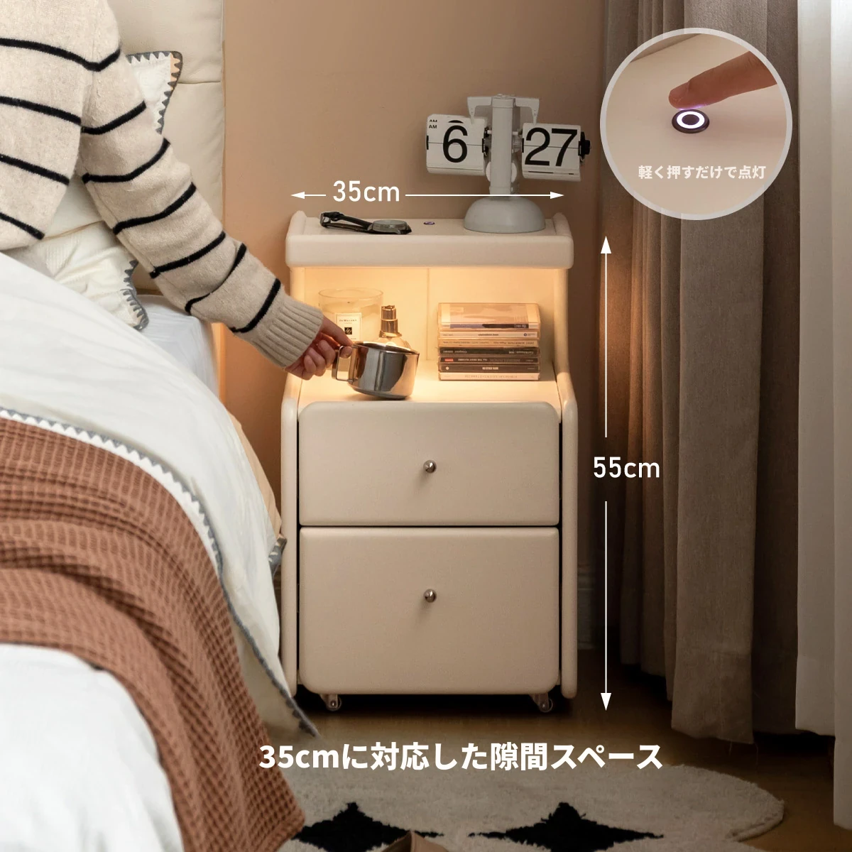 源氏木语の無垢材サイドテーブル - 移動可能なホワイトベッドサイドキャビネット、クリーム色のライト付きデザインで、寝室の収納にも最適!おしゃれで機能的な小物収納を実現!