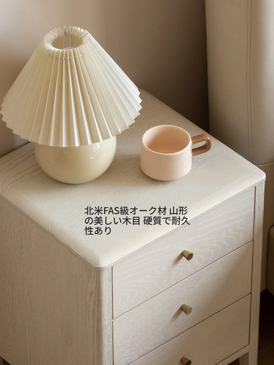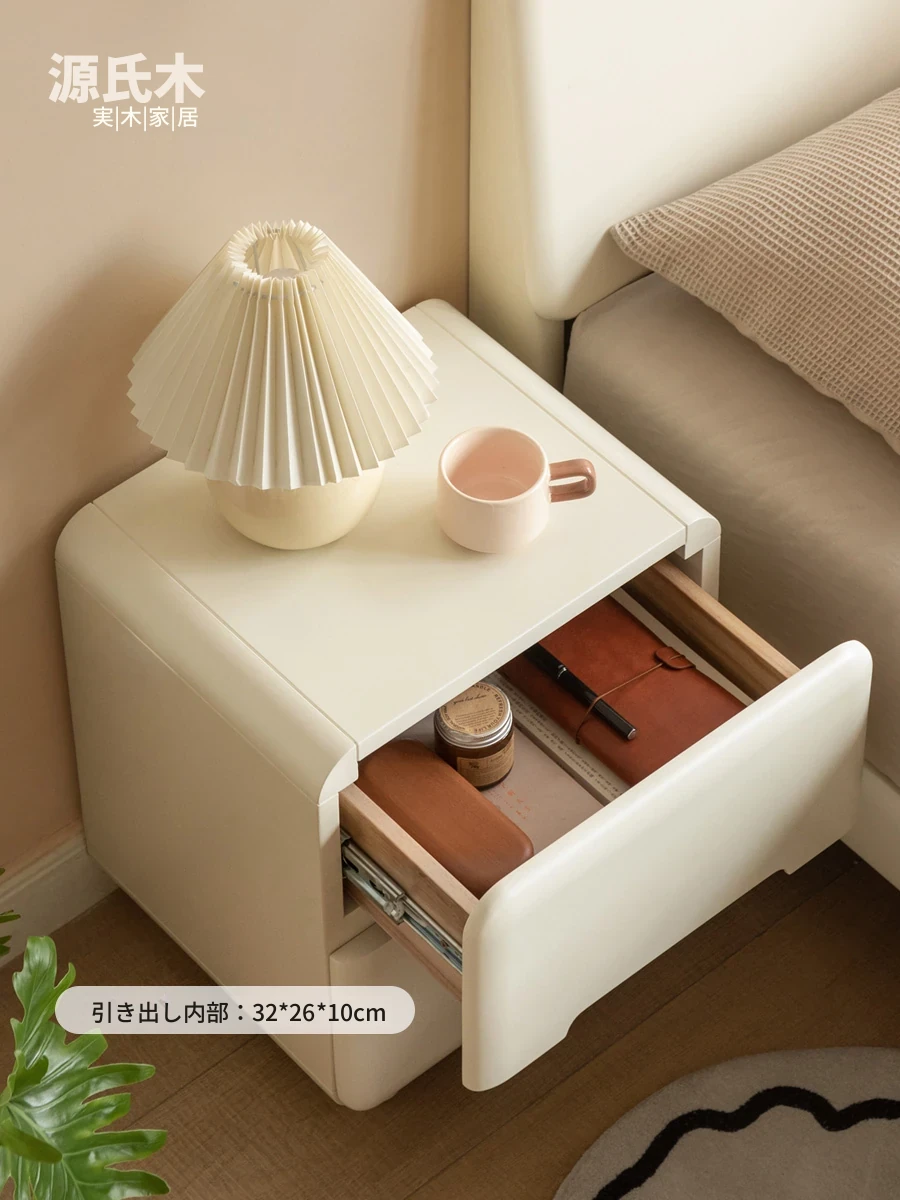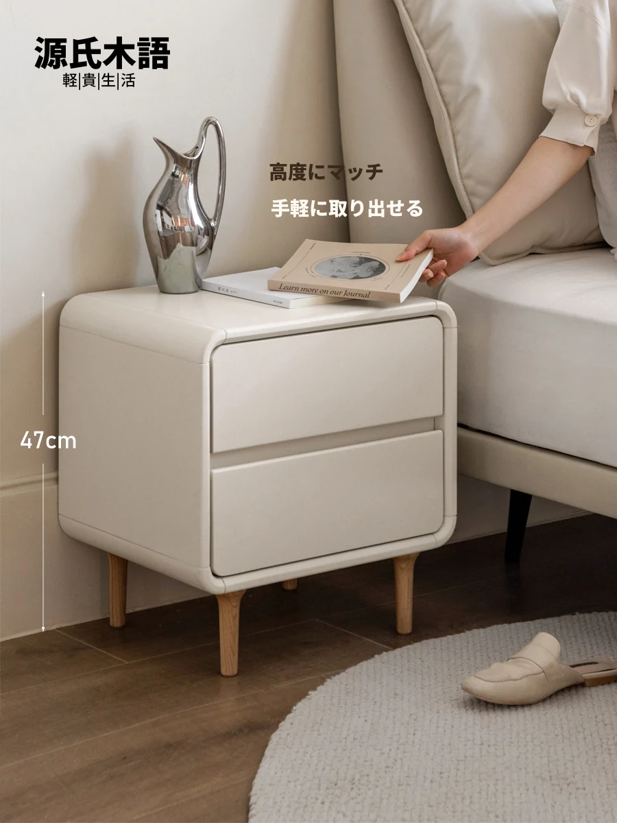 源氏木语の無垢材ナイトテーブル:クリームカラーの家庭用ベッドサイドストレージ、コンパクトなホワイト収納、素敵なお部屋を演出する小型家具!