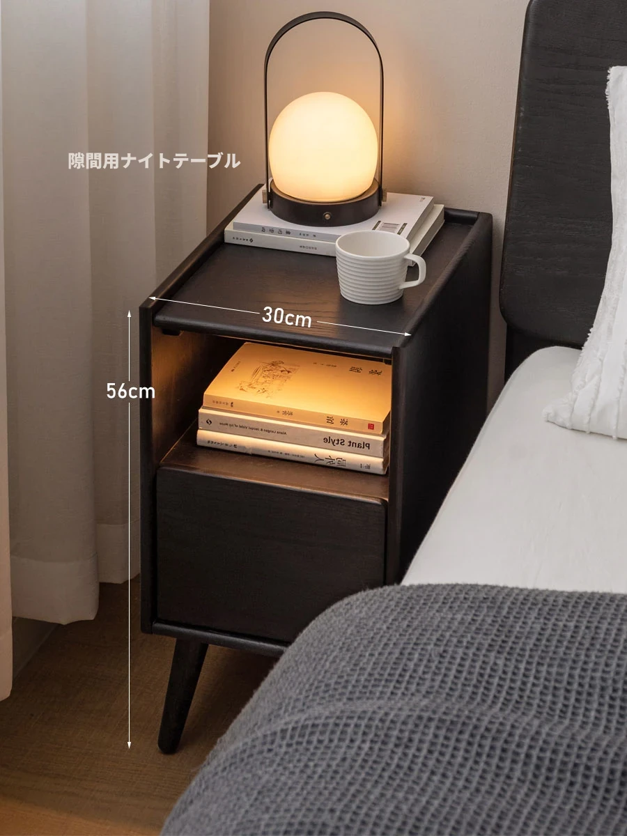源氏木語モダン実木ベッドサイドテーブル - スリムデザインのオークブラック収納キャビネット、照明付きで狭いスペースにも最適!