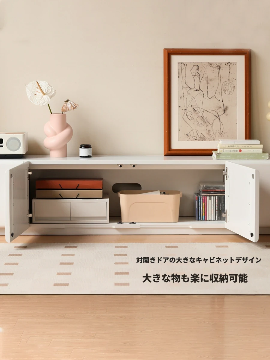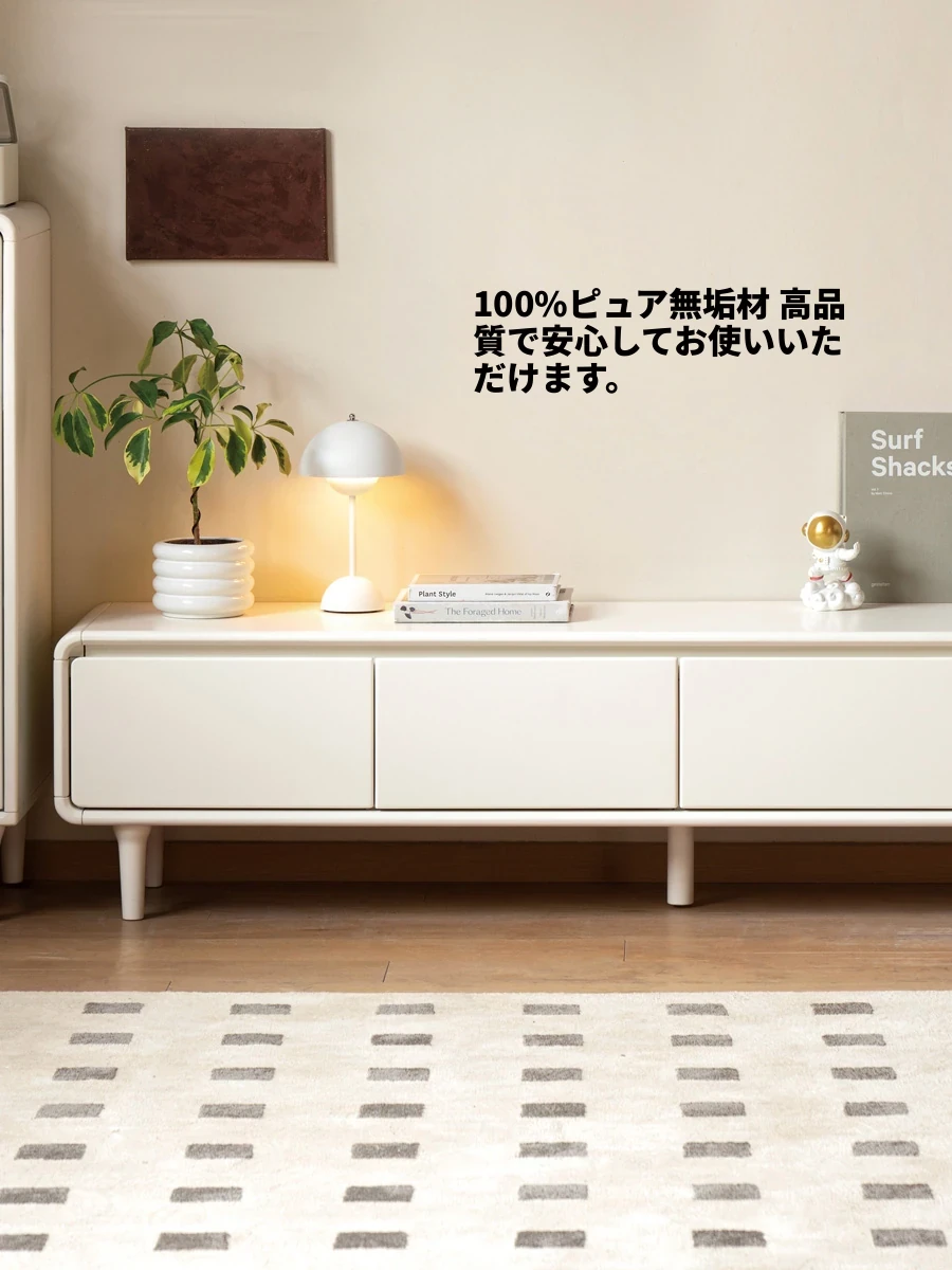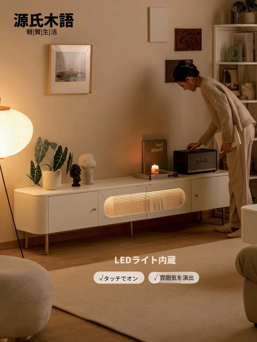 源氏木語の全木製テレビキャビネット|イタリアンミニマルデザインの収納付き低いローボード|小さなリビングに最適なホワイト収納キャビネット