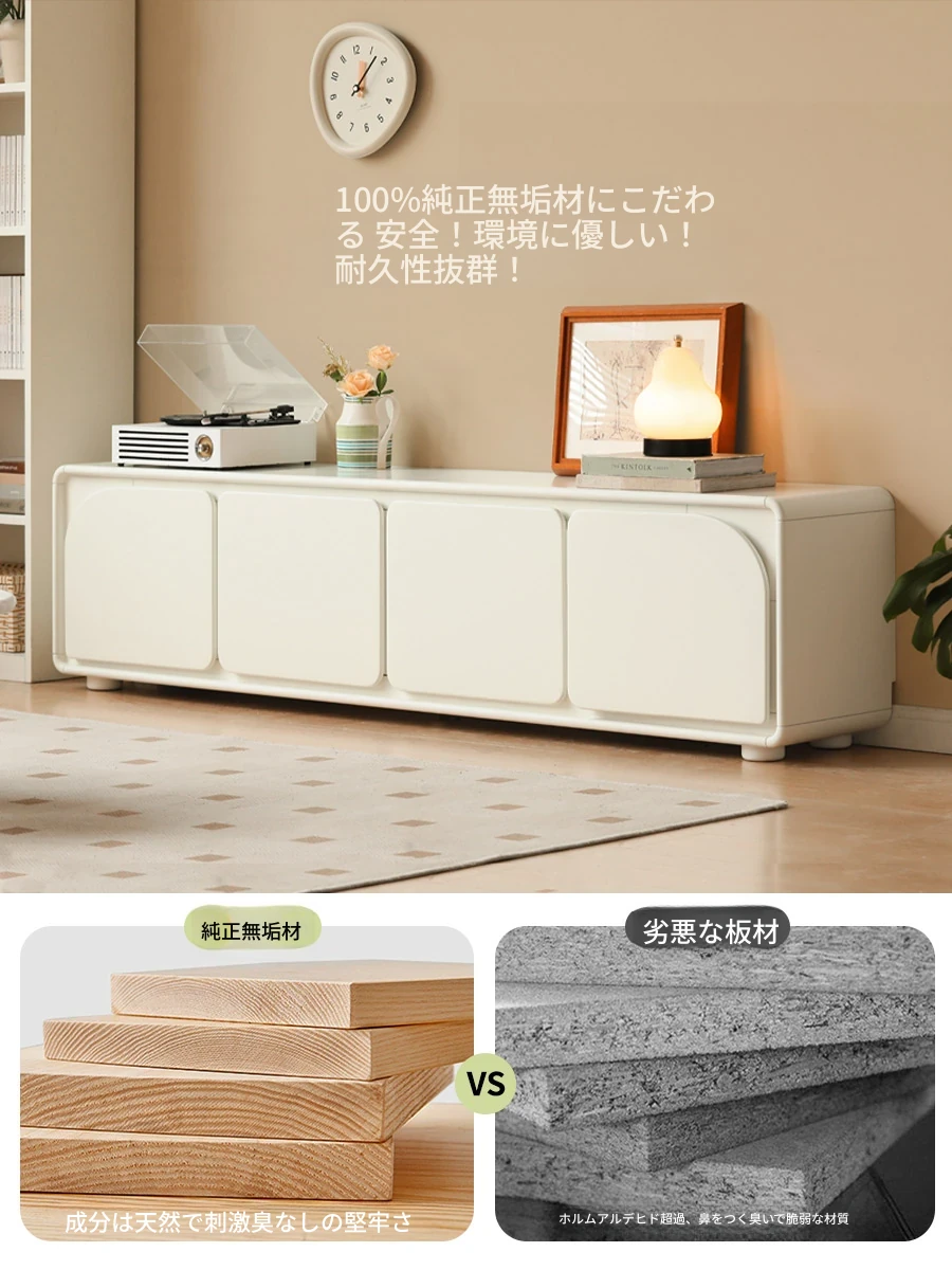 源氏木語の天然木製テレビキャビネット・クリームホワイトのフロアストレージキャビネット!小さなリビングにぴったりな実用的な収納力とスタイリッシュなデザインで、あなたのホームをより素敵に演出します。