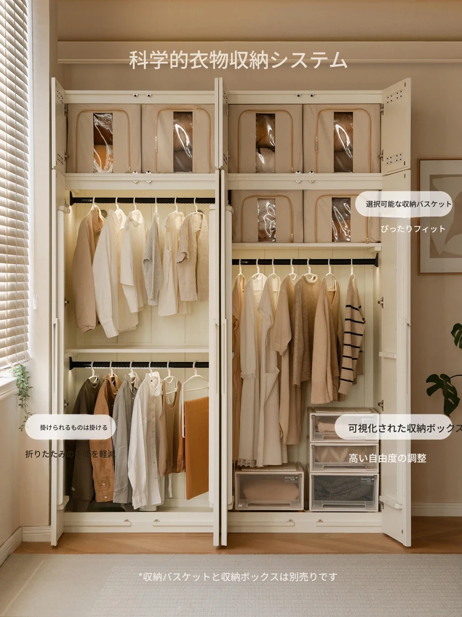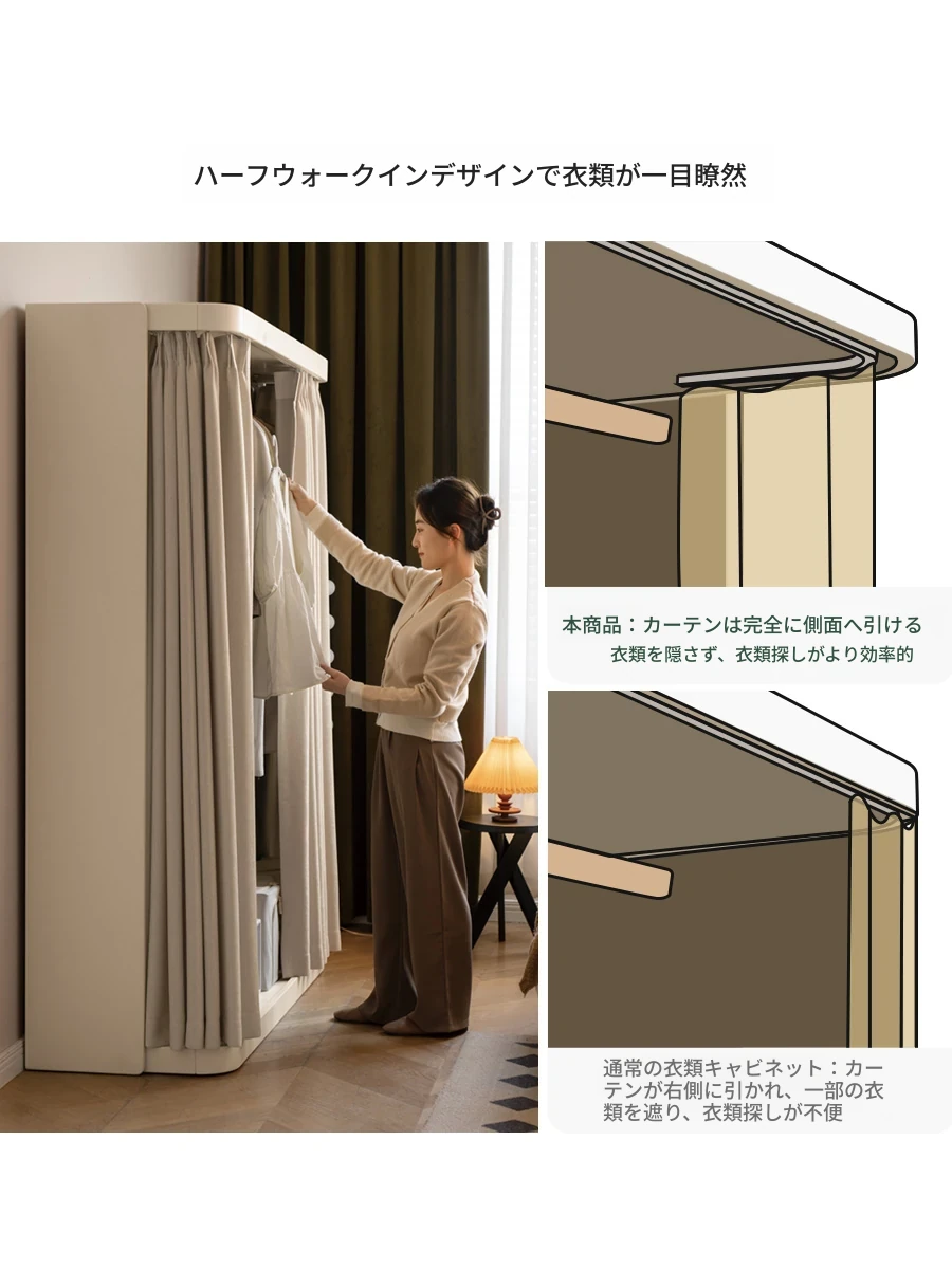 源氏木语の無垢材ワードローブ - シンプルでスタイリッシュな寝室収納、ホワイトクリーム風の半入りタイプ、布カーテン付きでおしゃれな家用クローゼット!