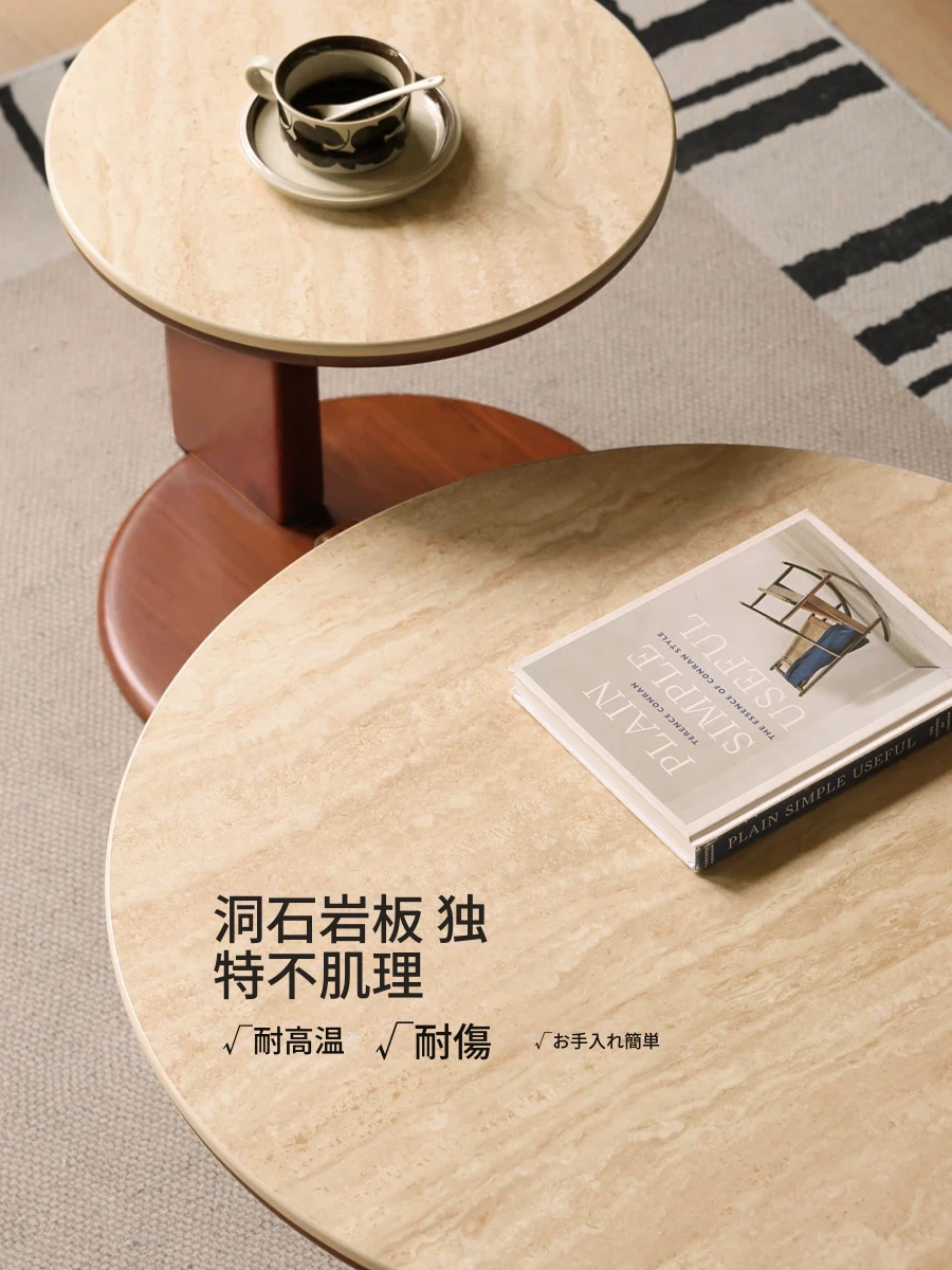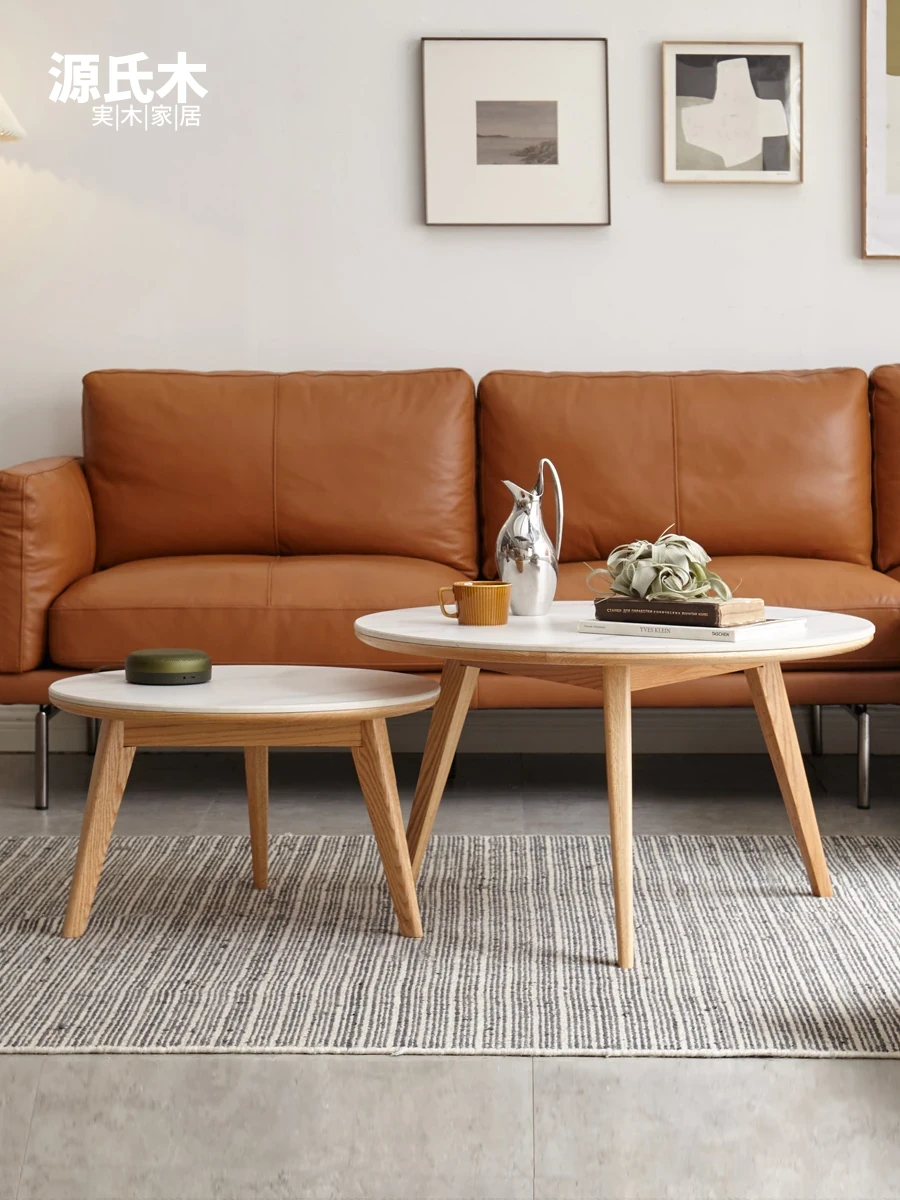 源氏木语 モダンデザインの実木ラウンドコーヒーテーブル - 小型住宅にもぴったりな岩板風テーブルトップの高級茶卓!デザイナーズ家具でおしゃれな空間を演出!
