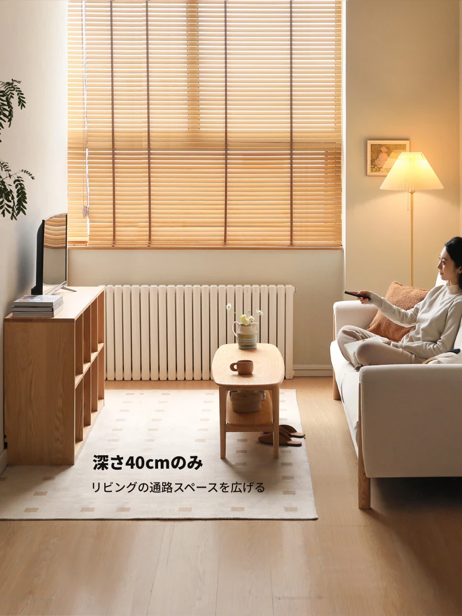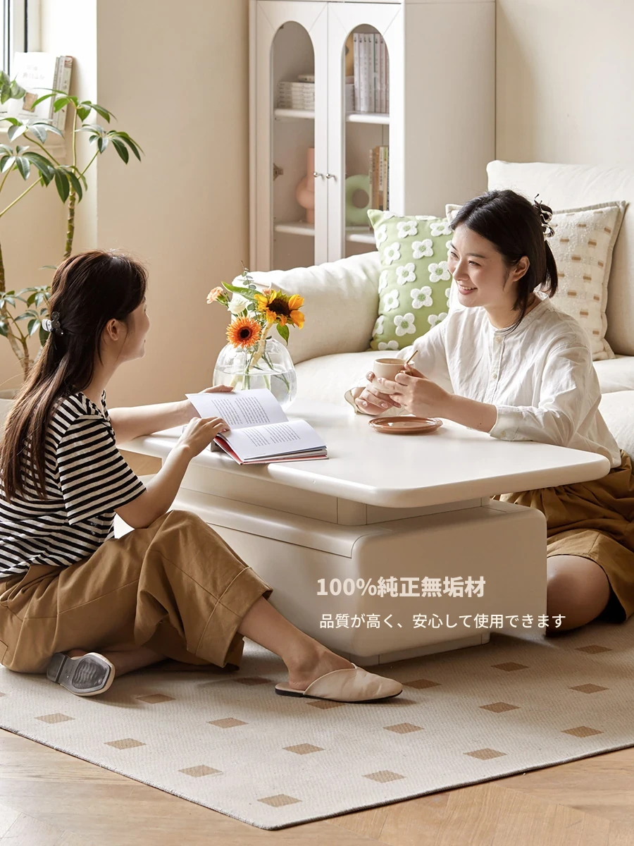 源氏木语リアルウッドティーテーブル|クリームカラーの小型インテリアに最適!収納力抜群なシンプルデザインで、白を基調とした居心地の良いリビング空間を演出します。