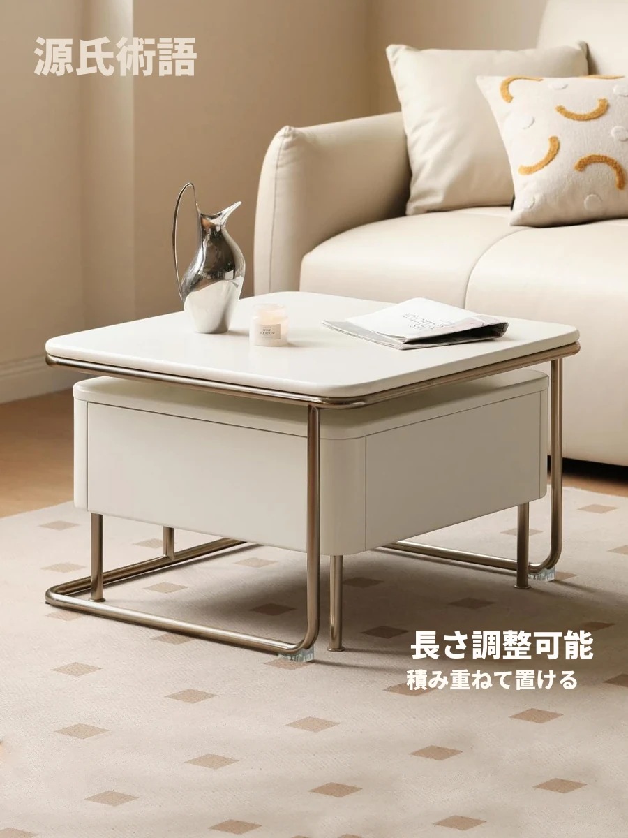 源氏木语 無垢材のコンビネーションテーブル - クリームカラーのアイアンフレームで、シンプルなリビングにぴったり!小型サイズで伸縮可能、機能性とスタイルを両立させたオシャレなコーヒーテーブル。