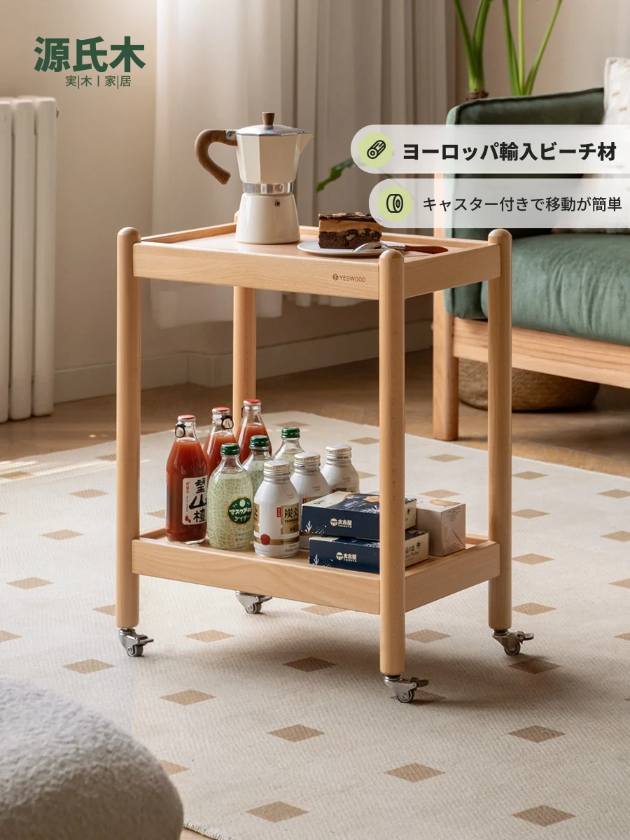 源氏木语「天然木製」サイドテーブル – モダンでシンプルなリビング用、ソファ脇にぴったりな多機能ダブル収納移動式カート!おしゃれなインテリアに最適です。