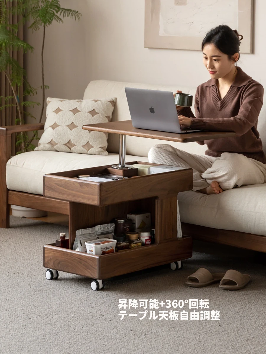 源氏木语 無垢材の昇降式回転サイドテーブル - ブラックウォールナット製、リビングにぴったりの移動可能な小型キャビネット!