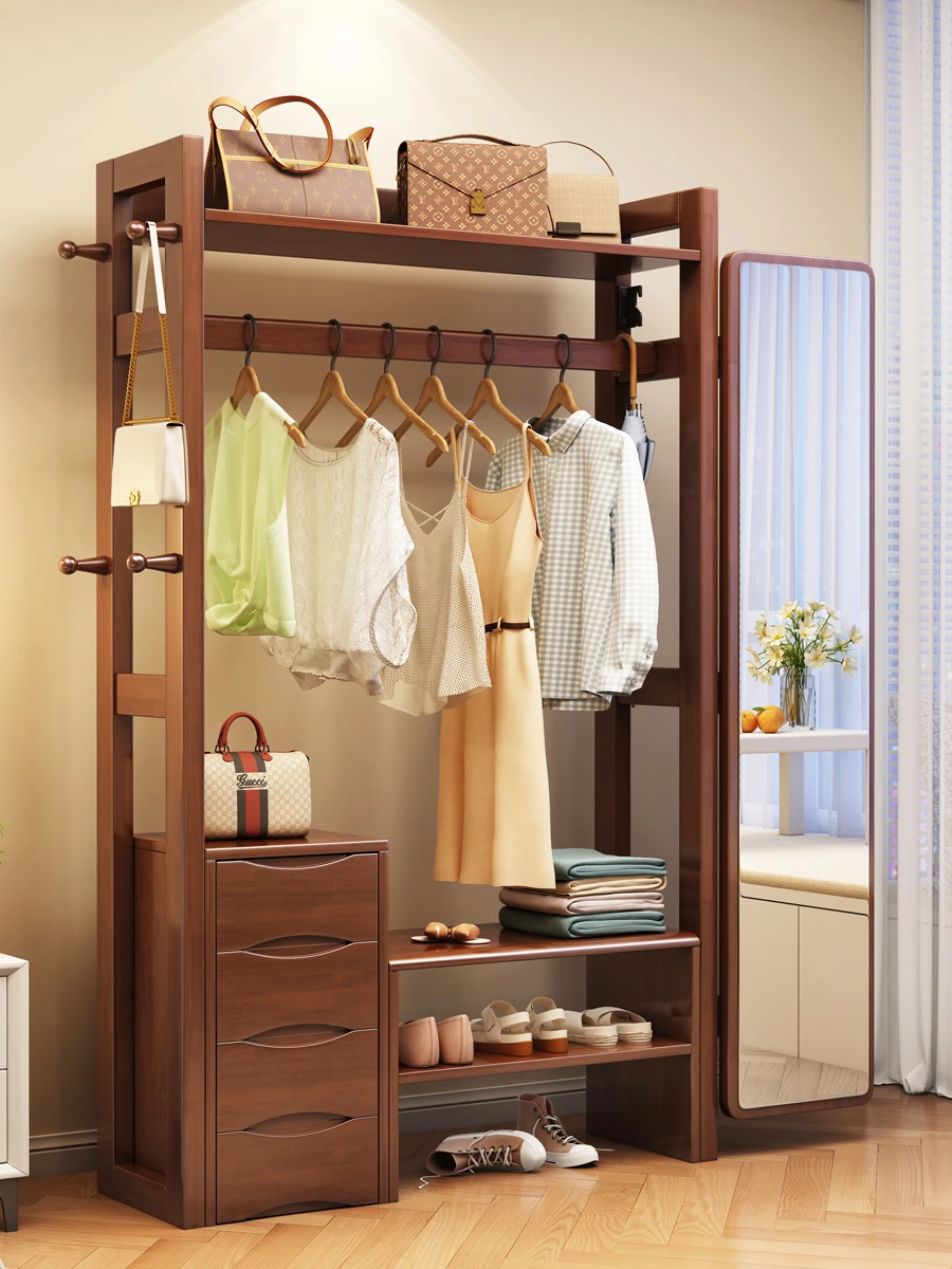 **Multifunctional Solid Wood Floor Coat Rack with Built-in Dressing Mirror - Stylish Wardrobe Storage Solution for Bedroom**