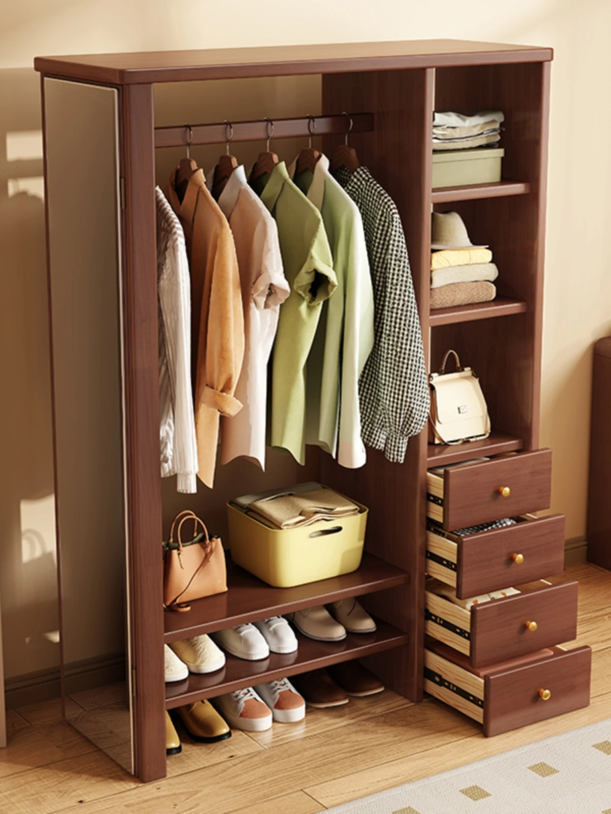 "Solid Wood Clothing Rack with Full-Length Mirror and Storage Cabinet - Stylish Floor Mirror Coat Stand for Bedroom Organization"